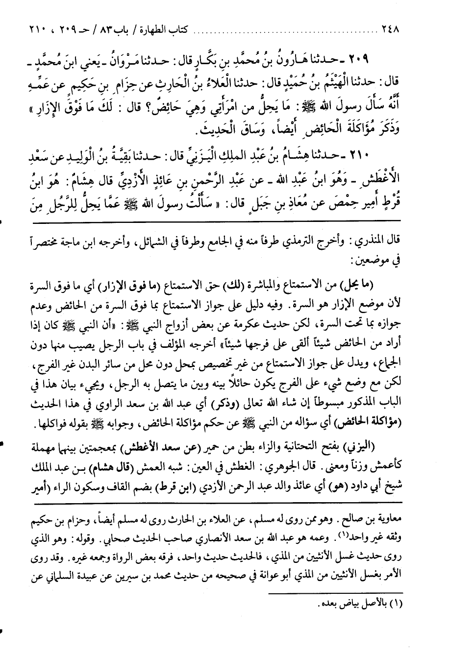 قَالَ الْمُنْذِرِيُّ وَأَخْرَجَ التِّرْمِذِيُّ طَرَفًا مِنْهُ فِي الجامع وطرفا في الشمائل وأخرجه بن مَاجَهْ مُخْتَصَرًا فِي مَوْضِعَيْنِ [212] (مَا يَحِلُّ) مِنَ الِاسْتِمْتَاعِ وَالْمُبَاشَرَةِ (لَكَ) حَقُّ الِاسْتِمْتَاعِ (مَا فَوْقَ الْإِزَارِ) أَيْ مَا فَوْقَ السُّرَّةِ لِأَنَّ مَوْضِعَ الْإِزَارِ هُوَ السُّرَّةُ