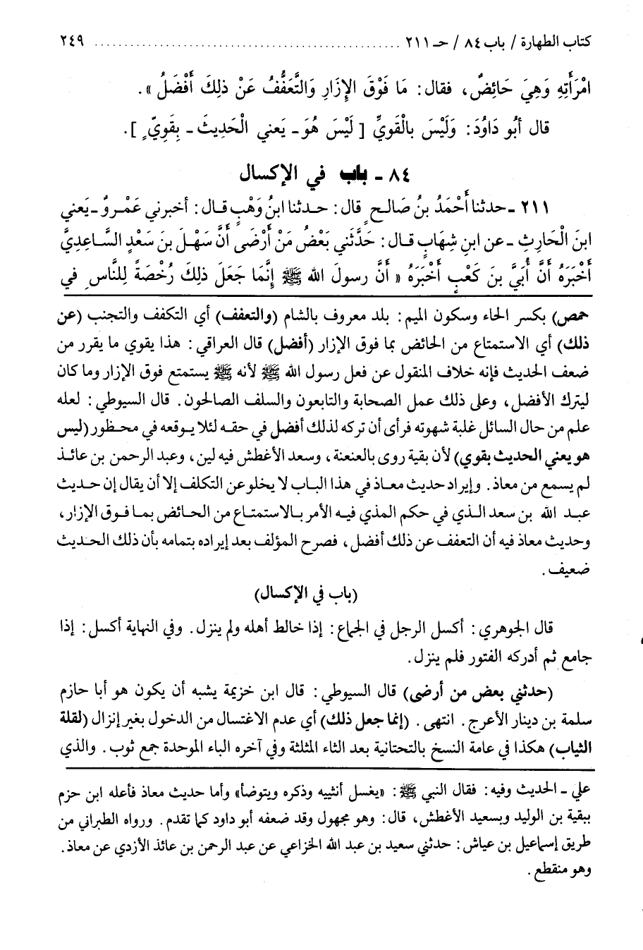 وَإِيرَادُ حَدِيثِ مُعَاذٍ فِي هَذَا الْبَابِ لَا يَخْلُو عَنِ التَّكَلُّفِ إِلَّا أَنْ يُقَالَ إِنَّ حَدِيثَ عَبْدِ اللَّهِ بْنِ سَعْدٍ الَّذِي فِي حُكْمِ الْمَذْيِ فِيهِ الْأَمْرُ بِالِاسْتِمْتَاعِ مِنَ الْحَائِضِ بِمَا فَوْقَ الْإِزَارِ وَحَدِيثَ مُعَاذٍ فِيهِ أَنَّ التَّعَفُّفَ عَنْ ذَلِكَ أَفْضَلُ فَصَرَّحَ الْمُؤَلِّفُ بَعْدَ إِيرَادِهِ بِتَمَامِهِ بِأَنَّ ذَلِكَ الْحَدِيثَ ضَعِيفٌ