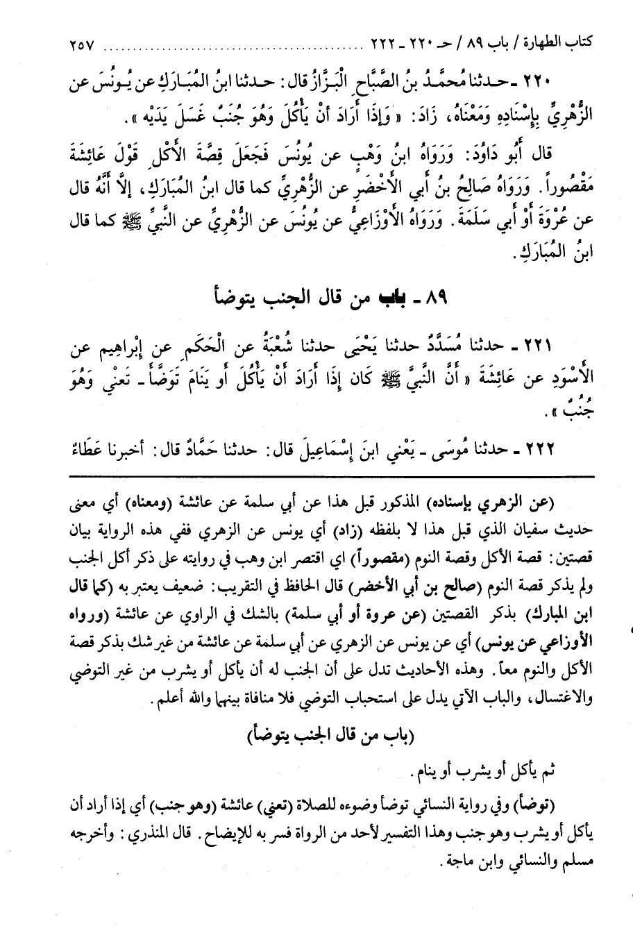 [223] (عَنِ الزُّهْرِيِّ بِإِسْنَادِهِ) الْمَذْكُورِ قَبْلَ هَذَا عَنْ أَبِي سَلَمَةَ عَنْ عَائِشَةَ (وَمَعْنَاهُ) أَيْ مَعْنَى حَدِيثِ سُفْيَانَ الَّذِي قَبْلَ هَذَا لَا بِلَفْظِهِ (زَادَ) أَيْ يُونُسُ عَنِ الزُّهْرِيِّ فَفِي هَذِهِ الرِّوَايَةِ بَيَانُ قِصَّتَيْنِ قِصَّةُ الْأَكْلِ وَقِصَّةُ النَّوْمِ (مقصورا) أي اقتصر بن وَهْبٍ فِي رِوَايَتِهِ عَلَى ذِكْرِ أَكْلِ الْجُنُبِ وَلَمْ يَذْكُرْ قِصَّةَ النَّوْمِ (صَالِحُ بْنُ أَبِي الْأَخْضَرِ) قَالَ الْحَافِظُ فِي التَّقْرِيبِ ضَعِيفٌ يُعْتَبَرُ به (كما قال بن الْمُبَارَكِ) بِذِكْرِ الْقِصَّتَيْنِ (عَنْ عُرْوَةَ أَوْ أَبِي سَلَمَةَ) بِالشَّكِّ فِي الرَّاوِي عَنْ عَائِشَةَ (وَرَوَاهُ الْأَوْزَاعِيُّ عَنْ يُونُسَ) أَيْ عَنْ يُونُسَ عَنِ الزُّهْرِيِّ عَنْ أَبِي سَلَمَةَ عَنْ عَائِشَةَ مِنْ غَيْرِ شَكٍّ بِذِكْرِ قِصَّةِ الْأَكْلِ وَالنَّوْمِ مَعًا