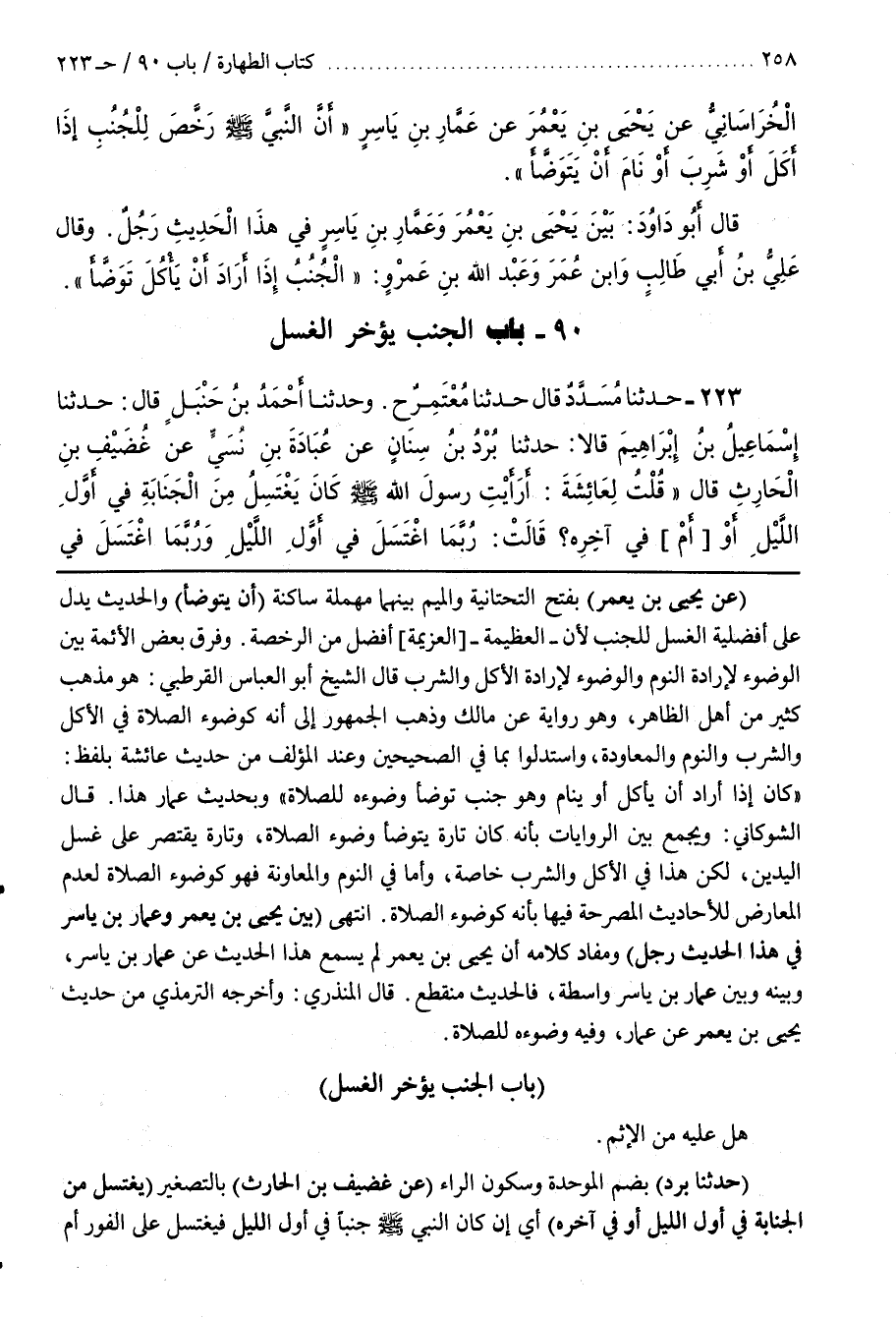 [225] (عَنْ يَحْيَى بْنِ يَعْمَرَ) بِفَتْحِ التَّحْتَانِيَّةِ وَالْمِيمِ بَيْنَهُمَا مُهْمَلَةٌ سَاكِنَةٌ (أَنْ يَتَوَضَّأَ) وَالْحَدِيثُ يَدُلُّ عَلَى أَفْضَلِيَّةِ الْغُسْلِ لِلْجُنُبِ لِأَنَّ الْعَظِيمَةَ (الْعَزِيمَةَ) أَفْضَلُ مِنَ الرُّخْصَةِ