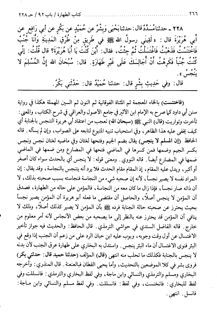 [231] (فَاخْتَنَسْتُ) بِالْخَاءِ الْمُعْجَمَةِ ثُمَّ الْمُثَنَّاةِ الْفَوْقَانِيَّةِ ثُمَّ النُّونِ ثُمَّ السِّينِ الْمُهْمَلَةِ هَكَذَا فِي رِوَايَةِ سُنَنِ أَبِي دَاوُدَ كَمَا صَرَّحَ بِهِ الْإِمَامُ بن الْأَثِيرِ فِي جَامِعِ الْأُصُولِ وَالْعِرَاقِيُّ فِي شَرْحِ الْكِتَابِ وَالْمَعْنَى تَأَخَّرْتُ وَتَوَارَيْتُ (قَالَ) النَّبِيُّ صَلَّى اللَّهُ عَلَيْهِ وَسَلَّمَ (سُبْحَانَ اللَّهِ) تَعَجَّبَ مِنِ اعْتِقَادِ أَبِي هُرَيْرَةَ التَّنَجُّسَ بِالْجَنَابَةِ أَيْ كَيْفَ يخفي عليه هذا الظاهر وفي اسْتِحْبَابُ تَنْبِيهِ الْمَتْبُوعِ لِتَابِعِهِ عَلَى الصَّوَابِ وَإِنْ لَمْ يَسْأَلْهُ