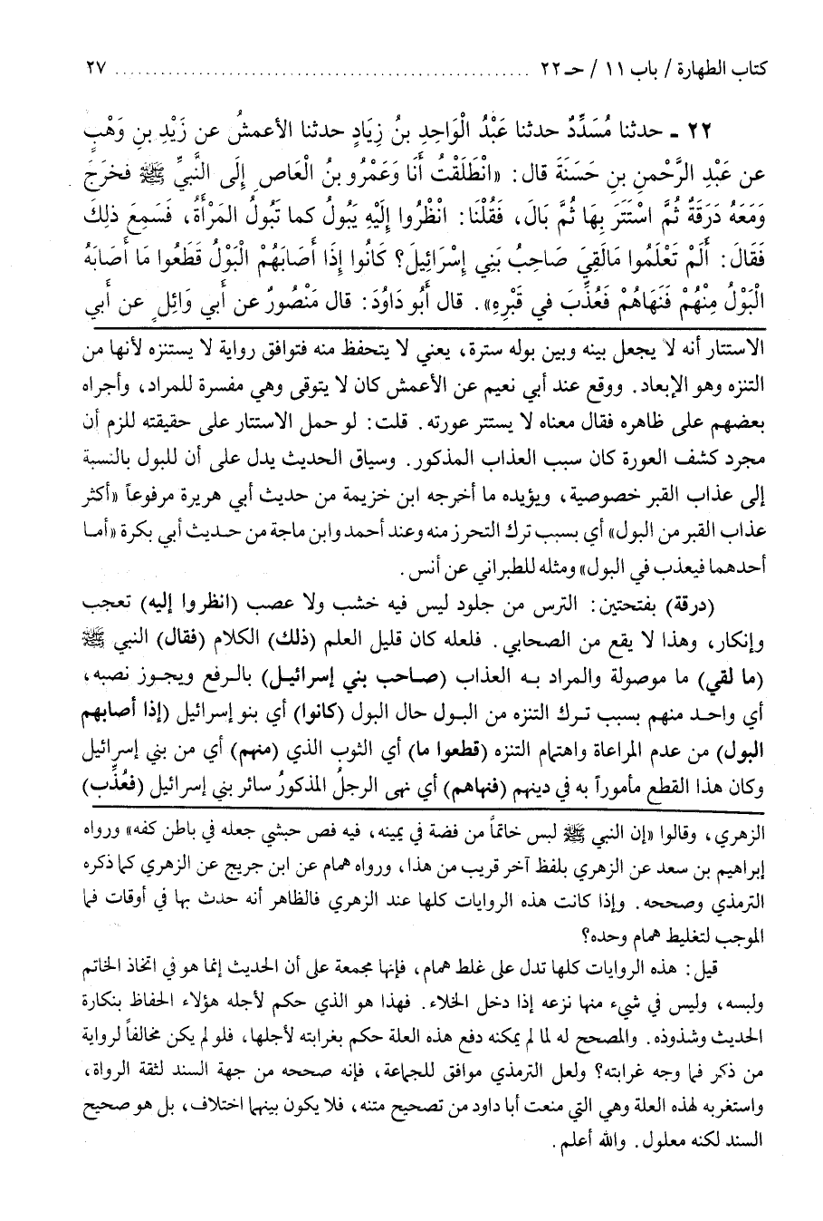 [22] (دَرَقَةٌ) بِفَتْحَتَيْنِ التُّرْسُ مِنْ جُلُودٍ لَيْسَ فِيهِ خَشَبٌ وَلَا عَصَبٌ (انْظُرُوا إِلَيْهِ) تَعَجُّبٌ وَإِنْكَارٌ وَهَذَا لَا يَقَعُ مِنَ الصَّحَابِيِّ فَلَعَلَّهُ كَانَ قَلِيلَ الْعِلْمِ (ذَلِكَ) الْكَلَامَ (فَقَالَ) النَّبِيُّ صَلَّى اللَّهُ عَلَيْهِ وَسَلَّمَ (مَا لَقِيَ) مَا مَوْصُولَةٌ وَالْمُرَادُ بِهِ الْعَذَابُ (صَاحِبُ بَنِي إِسْرَائِيلَ) بِالرَّفْعِ وَيَجُوزُ نَصْبُهُ أَيْ وَاحِدٌ مِنْهُمْ بِسَبَبِ تَرْكِ التَّنَزُّهِ مِنَ الْبَوْلِ حَالَ الْبَوْلِ (كَانُوا) أَيْ بَنُو إِسْرَائِيلَ (إِذَا أَصَابَهُمُ الْبَوْلُ) مِنْ عَدَمِ الْمُرَاعَاةِ وَاهْتِمَامِ التَّنَزُّهِ (قَطَعُوا مَا) أَيِ الثَّوْبَ الَّذِي (مِنْهُمْ) أَيْ مِنْ بَنِي إِسْرَائِيلَ وَكَانَ هَذَا الْقَطْعُ مَأْمُورًا بِهِ فِي دِينِهِمْ (فَنَهَاهُمْ) أَيْ نَهَى الرَّجُلُ الْمَذْكُورُ سَائِرَ بَنِي إِسْرَائِيلَ (فعذب