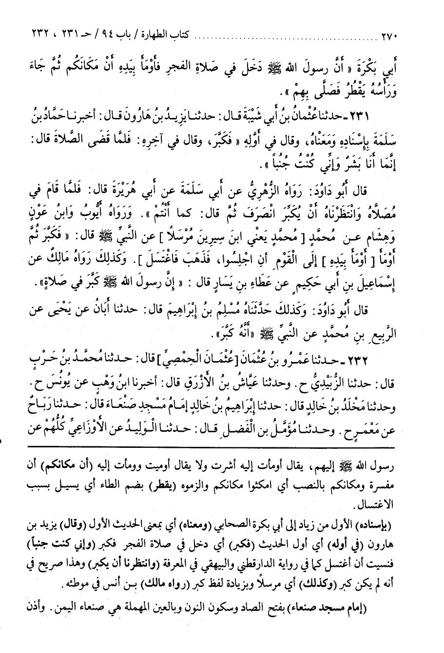 [234] (بِإِسْنَادِهِ) الْأَوَّلِ مِنْ زِيَادٍ إِلَى أَبِي بَكْرَةَ الصَّحَابِيِّ (وَمَعْنَاهُ) أَيْ بِمَعْنَى الْحَدِيثِ الْأَوَّلِ (وَقَالَ) يَزِيدُ بْنُ هَارُونَ (فِي أَوَّلِهِ) أَيْ أَوَّلِ الْحَدِيثِ (فَكَبَّرَ) أَيْ دَخَلَ فِي صَلَاةِ الْفَجْرِ فَكَبَّرَ (وَإِنِّي كُنْتُ جُنُبًا) فَنَسِيتُ أَنْ أَغْتَسِلَ كَمَا فِي رِوَايَةِ الدَّارَقُطْنِيِّ وَالْبَيْهَقِيِّ فِي الْمَعْرِفَةِ (وَانْتَظَرْنَا أَنْ يُكَبِّرَ) وَهَذَا صَرِيحٌ فِي أَنَّهُ لَمْ يَكُنْ كَبَّرَ (وَكَذَلِكَ) أَيْ مُرْسَلًا وَبِزِيَادَةِ لَفْظِ كَبَّرَ (رواه مالك) بن أنس في موطإه