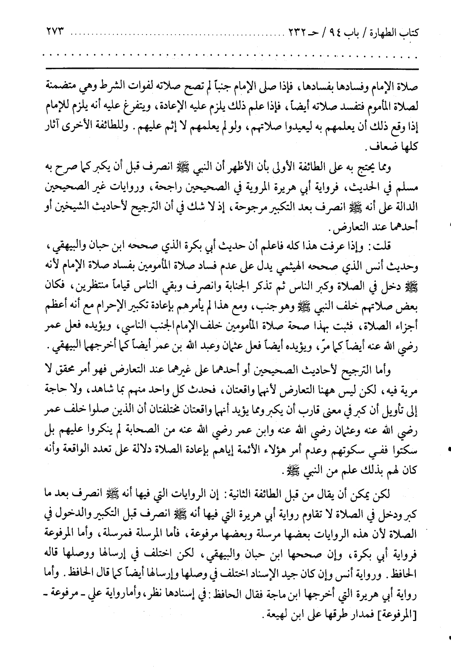 وَمِمَّا يُحْتَجُّ بِهِ عَلَى الطَّائِفَةِ الْأُولَى بِأَنَّ الْأَظْهَرَ أَنَّ النَّبِيَّ صَلَّى اللَّهُ عَلَيْهِ وَسَلَّمَ انْصَرَفَ قَبْلَ أَنْ يُكَبِّرَ كَمَا صَرَّحَ بِهِ مُسْلِمٌ فِي الْحَدِيثِ فَرِوَايَةُ أَبِي هُرَيْرَةَ الْمَرْوِيَّةُ فِي الصَّحِيحَيْنِ رَاجِحَةٌ وَرِوَايَاتُ غَيْرِ الصَّحِيحَيْنِ الدَّالَّةُ عَلَى أَنَّهُ صَلَّى اللَّهُ عَلَيْهِ وَسَلَّمَ انْصَرَفَ بَعْدَ التَّكْبِيرِ مَرْجُوحَةٌ إِذْ لَا شَكَّ فِي أَنَّ التَّرْجِيحَ لِأَحَادِيثِ الشَّيْخَيْنِ أَوْ أَحَدِهِمَا عِنْدَ التَّعَارُضِ