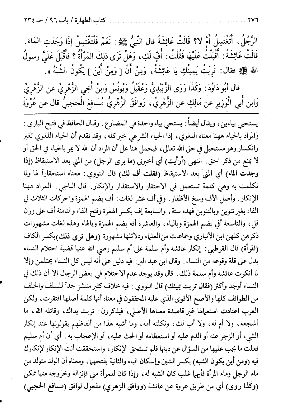 أَيْ إِنَّ أُمَّ سُلَيْمٍ فَعَلَتْ مَا يَجِبُ عَلَيْهَا مِنَ السُّؤَالِ عَنْ دِينِهَا فَلَمْ تَسْتَحِقَّ الْإِنْكَارَ وَاسْتَحْقَقْتِ أَنْتِ الْإِنْكَارَ لِإِنْكَارِكِ فِيهِ (وَمِنْ أَيْنَ يَكُونُ الشِّبْهُ) بِكَسْرِ الشِّينِ وَإِسْكَانِ الْبَاءِ وَالثَّانِيَةُ بِفَتْحِهِمَا وَمَعْنَاهُ أَنَّ الْوَلَدَ مُتَوَلِّدٌ مِنْ مَاءِ الرَّجُلِ وَمَاءِ الْمَرْأَةِ فَأَيُّهُمَا غَلَبَ كَانَ الشَّبَهُ لَهُ وَإِذَا كَانَ لِلْمَرْأَةِ مَنِيٌّ فَإِنْزَالُهُ وَخُرُوجُهُ مِنْهَا مُمْكِنٌ (وَكَذَا رَوَى) أَيْ مِنْ طَرِيقِ عُرْوَةَ عَنْ عَائِشَةَ (وَوَافَقَ الزُّهْرِيَّ) مَفْعُولٌ لِوَافَقَ (مسافع الحجبي