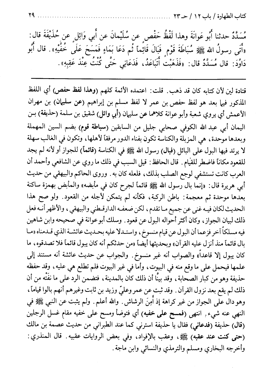 قُلْتُ اعْتَمَدَهُ الْأَئِمَّةُ كُلُّهُمْ (وَهَذَا لَفْظُ حَفْصٍ) أَيِ اللَّفْظُ الْمَذْكُورُ فِيمَا بَعْدُ هُوَ لَفْظُ حَفْصِ بْنِ عُمَرَ لَا لَفْظُ مُسْلِمِ بْنِ إِبْرَاهِيمَ (عَنْ سُلَيْمَانَ) بْنِ مِهْرَانَ الْأَعْمَشِ أَيْ يَرْوِي شُعْبَةُ وَأَبُو عَوَانَةَ كِلَاهُمَا عَنْ سُلَيْمَانَ (أَبِي وَائِلٍ) شَقِيقِ بْنِ سَلَمَةَ (حُذَيْفَةَ) بْنِ الْيَمَانِ أَبِي عَبْدِ اللَّهِ الْكُوفِيِّ صَحَابِيٌّ جَلِيلٌ مِنَ السَّابِقِينَ (سُبَاطَةَ قَوْمٍ) بِضَمِّ السِّينِ الْمُهْمَلَةِ وَبَعْدَهَا مُوَحَّدَةٌ هِيَ الْمَزْبَلَةُ وَالْكُنَاسَةُ تَكُونُ بِفِنَاءِ الدُّورِ مِرْفَقًا لِأَهْلِهَا وَتَكُونُ فِي الْغَالِبِ سَهْلَةً لَا يَرْتَدُّ فِيهَا الْبَوْلُ عَلَى الْبَائِلِ (فَبَالَ) رسول الله صلى الله عليه وسلم في الْكُنَاسَةِ (قَائِمًا) لِلْجَوَازِ أَوْ لِأَنَّهُ لَمْ يَجِدْ لِلْقُعُودِ مَكَانًا فَاضْطُرَّ لِلْقِيَامِ