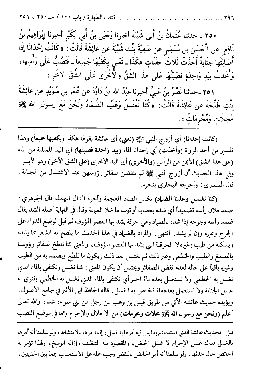 [253] (كَانَتْ إِحْدَانَا) أَيْ أَزْوَاجُ النَّبِيِّ صَلَّى اللَّهُ عَلَيْهِ وَسَلَّمَ (تَعْنِي) أَيْ عَائِشَةُ بِقَوْلِهَا هَكَذَا (بِكَفَّيْهَا جَمِيعًا) وَهَذَا تَفْسِيرٌ مِنْ أَحَدِ الرُّوَاةِ (وَأَخَذَتْ) أَيْ إِحْدَانَا الْمَاءَ (بِيَدٍ وَاحِدَةٍ فَصَبَّتْهَا) أَيِ الْيَدَ الْمُمْتَلِئَةَ مِنَ الْمَاءِ (عَلَى هَذَا الشِّقِّ) الْأَيْمَنِ مِنَ الرَّأْسِ (وَالْأُخْرَى) أَيِ الْيَدَ الْأُخْرَى (عَلَى الشِّقِّ الْآخَرِ) وَهُوَ الْأَيْسَرُ