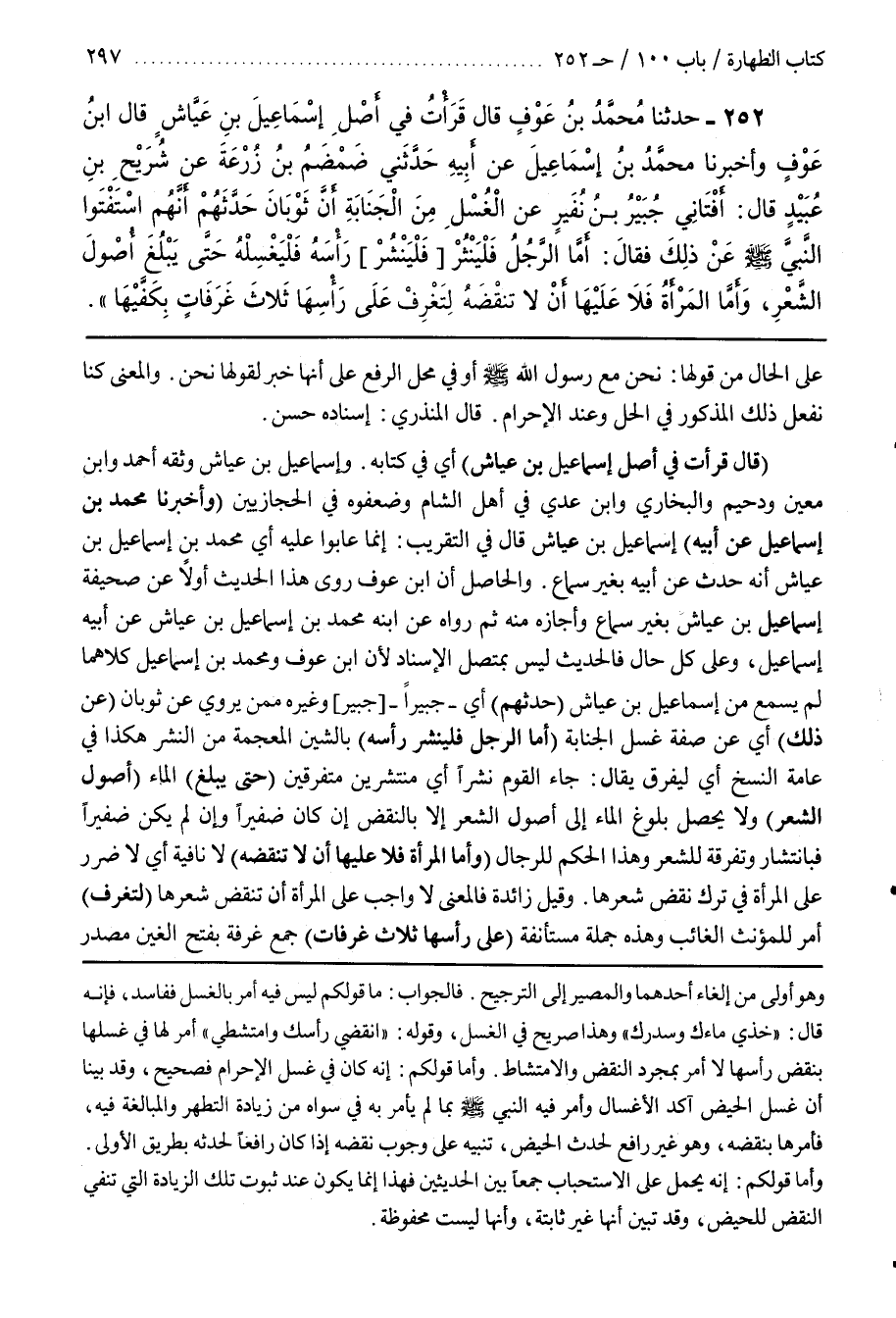 وَالْحَاصِلُ أن بن عَوْفٍ رَوَى هَذَا الْحَدِيثَ أَوَّلًا عَنْ صَحِيفَةِ إِسْمَاعِيلَ بْنِ عَيَّاشٍ بِغَيْرِ سَمَاعٍ وَأَجَازَهُ مِنْهُ ثُمَّ رَوَاهُ عَنِ ابْنِهِ مُحَمَّدِ بْنِ إِسْمَاعِيلَ بْنِ عَيَّاشٍ عَنْ أَبِيهِ إِسْمَاعِيلَ وَعَلَى كُلِّ حال فالحديث ليس بمتصل الإسناد لأن بن عَوْفٍ وَمُحَمَّدَ بْنَ إِسْمَاعِيلَ كِلَاهُمَا لَمْ يَسْمَعْ من إسماعيل بن عياش (حدثهم) أي جبيرا (جُبَيْرٌ) وَغَيْرُهُ مِمَّنْ يَرْوِي عَنْ ثَوْبَانَ (عَنْ ذَلِكَ) أَيْ عَنْ صِفَةِ غُسْلِ الْجَنَابَةِ (أَمَّا الرَّجُلُ فَلْيَنْشُرْ رَأْسَهُ) بِالشِّينِ الْمُعْجَمَةِ مِنَ النَّشْرِ هَكَذَا فِي عَامَّةِ النُّسَخِ أَيْ لِيُفَرِّقْ يُقَالُ جَاءَ الْقَوْمُ نَشْرًا أَيْ مُنْتَشِرِينَ مُتَفَرِّقِينَ (حَتَّى يَبْلُغَ) الْمَاءُ (أُصُولَ الشَّعْرِ) وَلَا يَحْصُلُ بُلُوغُ الْمَاءِ إِلَى أُصُولِ الشَّعْرِ إِلَّا بِالنَّقْضِ إِنْ كان ضفيرا وإن لم يكن ضفيرا فبالإنتشار وَتَفْرِقَةٍ لِلشَّعْرِ وَهَذَا الْحُكْمُ لِلرِّجَالِ (وَأَمَّا الْمَرْأَةُ فَلَا عَلَيْهَا أَنْ لَا تَنْقُضَهُ) لَا نَافِيَةٌ أَيْ لَا ضَرَرَ عَلَى الْمَرْأَةِ فِي تَرْكِ نَقْضِ شَعْرِهَا
