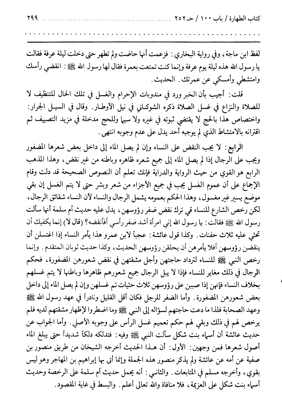 الرَّابِعُ لَا يَجِبُ النَّقْضُ عَلَى النِّسَاءِ وَإِنْ لَمْ يَصِلِ الْمَاءُ إِلَى دَاخِلِ بَعْضِ شَعْرِهَا الْمَضْفُورِ وَيَجِبُ عَلَى الرَّجُلِ إِذَا لَمْ يَصِلِ الْمَاءُ إِلَى جَمِيعِ شَعْرِهِ ظَاهِرِهِ وَبَاطِنِهِ مِنْ غَيْرِ نَقْضٍ وَهَذَا الْمَذْهَبُ الرَّابِعُ هُوَ الْقَوِيُّ مِنْ حَيْثُ الرِّوَايَةِ وَالدِّرَايَةِ فَإِنَّكَ تَعْلَمُ أَنَّ النُّصُوصَ الصَّحِيحَةَ قَدْ دَلَّتْ وَقَامَ الْإِجْمَاعُ عَلَى أَنَّ عُمُومَ الْغُسْلِ يَجِبُ فِي جَمِيعِ الْأَجْزَاءِ مِنْ شَعْرٍ وَبَشَرٍ حَتَّى لَا يَتِمَّ الْغُسْلُ إِنْ بَقِيَ مَوْضِعٌ يَسِيرٌ غَيْرَ مَغْسُولٍ وَهَذَا الْحُكْمُ بِعُمُومِهِ يَشْمَلُ الرِّجَالَ وَالنِّسَاءَ لِأَنَّ النِّسَاءَ شَقَائِقُ الرِّجَالِ لَكِنْ رَخَّصَ الشَّارِعُ لِلنِّسَاءِ في ترك نقض ضفر رؤوسهن يَدُلُّ عَلَيْهِ حَدِيثُ أُمِّ سَلَمَةَ أَنَّهَا سَأَلَتْ رَسُولَ اللَّهِ صَلَّى اللَّهُ عَلَيْهِ وَسَلَّمَ فَقَالَتْ يارسول اللَّهِ إِنِّي امْرَأَةٌ أَشُدُّ ضَفْرَ رَأْسِي أَفَأَنْقُضُهُ قَالَ لَا إِنَّمَا يَكْفِيكِ أَنْ تَحْثِي عَلَيْهِ ثَلَاثَ حَفَنَاتٍ