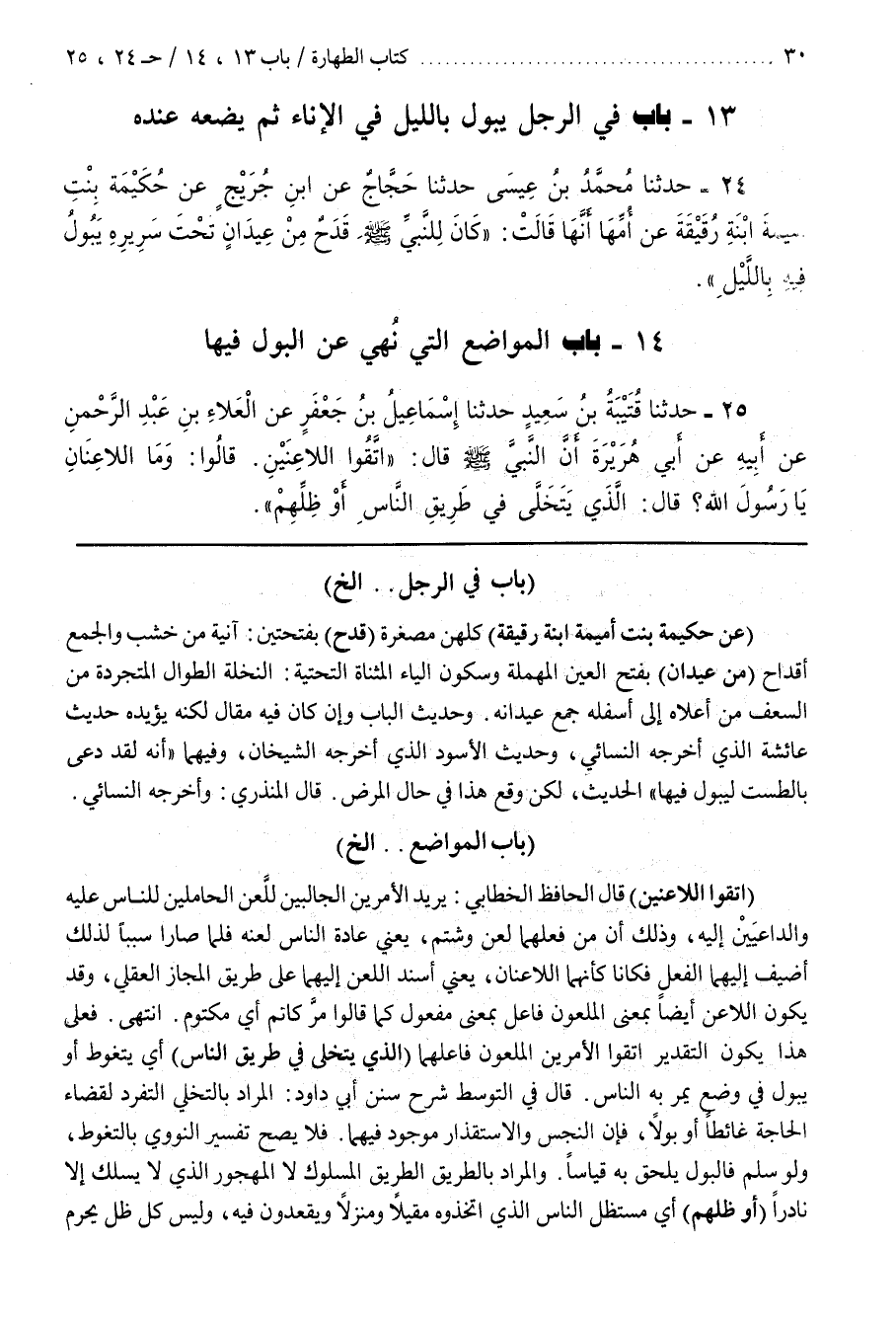 [25] إلخ (اتَّقُوا اللَّاعِنَيْنِ) قَالَ الْحَافِظُ الْخَطَّابِيُّ يُرِيدُ الْأَمْرَيْنِ الْجَالِبَيْنِ لِلَّعْنِ الْحَامِلَيْنِ لِلنَّاسِ عَلَيْهِ وَالدَّاعِيَيْنِ إِلَيْهِ وَذَلِكَ أَنَّ مَنْ فَعَلَهُمَا لُعِنَ وَشُتِمَ يَعْنِي عَادَةُ النَّاسِ لَعْنُهُ فَلَمَّا صَارَا سَبَبًا لِذَلِكَ أُضِيفَ إِلَيْهِمَا الْفِعْلُ فَكَانَا كَأَنَّهُمَا اللَّاعِنَانِ يَعْنِي أُسْنِدَ اللَّعْنُ إِلَيْهِمَا عَلَى طَرِيقِ الْمَجَازِ الْعَقْلِيِّ وَقَدْ يَكُونُ اللَّاعِنُ أَيْضًا بِمَعْنَى الْمَلْعُونِ فَاعِلٌ بمعنى مفعول كما قالوا مر كَاتِمٌ أَيْ مَكْتُومٌ