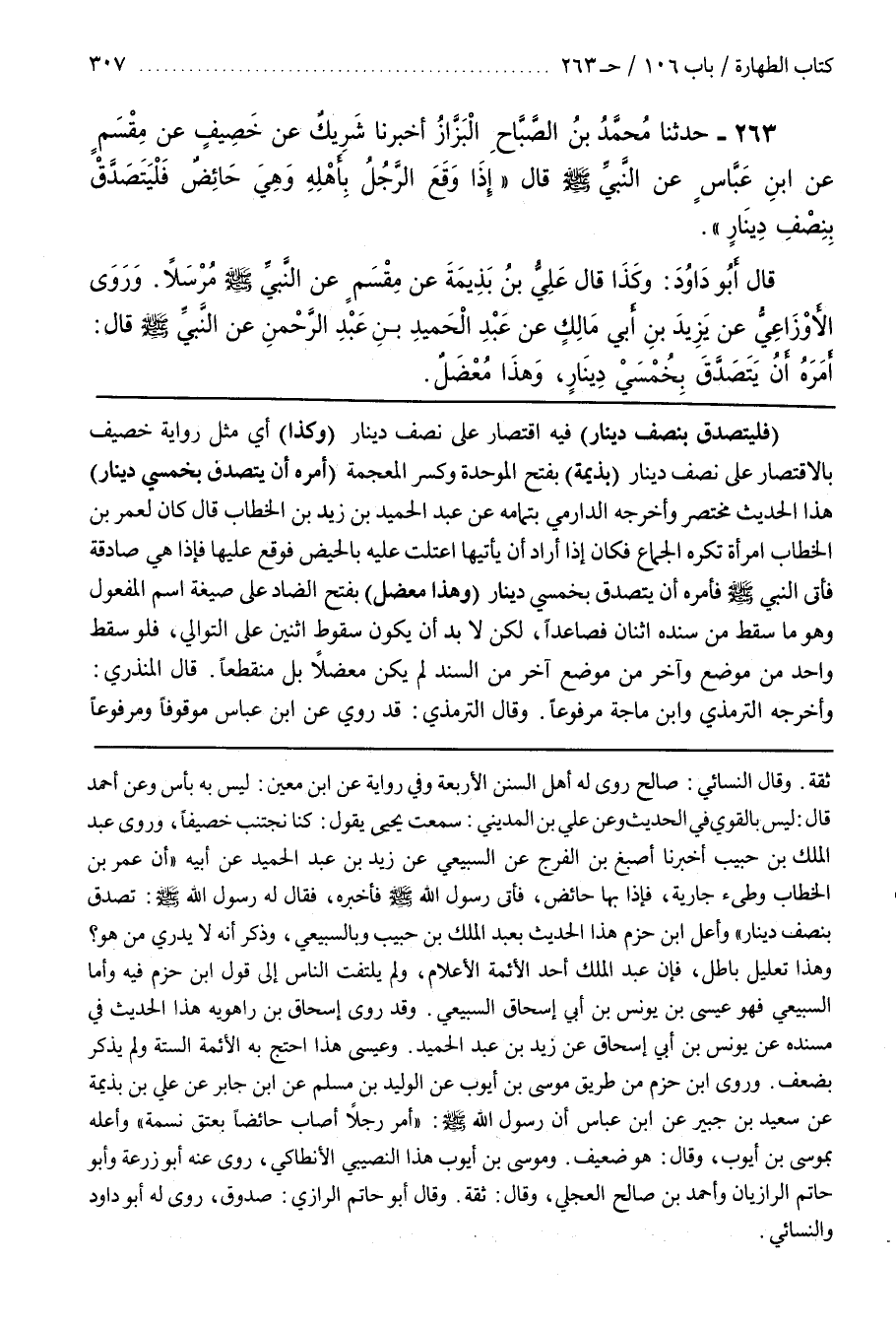 [266] (فَلْيَتَصَدَّقْ بِنِصْفِ دِينَارٍ) فِيهِ اقْتِصَارٌ عَلَى نِصْفِ دِينَارٍ (وَكَذَا) أَيْ مِثْلِ رِوَايَةِ خُصَيْفٍ بِالِاقْتِصَارِ عَلَى نِصْفِ دِينَارٍ (بَذِيمَةَ) بِفَتْحِ الْمُوَحَّدَةِ وَكَسْرِ الْمُعْجَمَةِ (أَمَرَهُ أَنْ يَتَصَدَّقَ بِخُمُسَيْ دِينَارٍ) هَذَا الْحَدِيثُ مُخْتَصَرٌ وَأَخْرَجَهُ الدَّارِمِيُّ بِتَمَامِهِ عَنْ عَبْدِ الْحَمِيدِ بْنِ زَيْدِ بْنِ الْخَطَّابِ قَالَ كَانَ لِعُمَرَ بْنِ الْخَطَّابِ امْرَأَةٌ تَكْرَهُ الْجِمَاعَ فَكَانَ إِذَا أَرَادَ أَنْ يَأْتِيَهَا اعْتَلَّتْ عَلَيْهِ بِالْحَيْضِ فَوَقَعَ عَلَيْهَا فَإِذَا هِيَ صَادِقَةٌ فَأَتَى النَّبِيَّ صَلَّى اللَّهُ عَلَيْهِ وَسَلَّمَ فَأَمَرَهُ أَنْ يَتَصَدَّقَ بِخُمُسَيْ دِينَارٍ (وَهَذَا مُعْضَلٌ) بِفَتْحِ الضَّادِ عَلَى صِيغَةِ اسْمِ الْمَفْعُولِ وَهُوَ مَا سَقَطَ مِنْ سَنَدِهِ اثْنَانِ فَصَاعِدًا لَكِنْ لَا بُدَّ أَنْ يَكُونَ سُقُوطُ اثْنَيْنِ عَلَى التَّوَالِي فَلَوْ سَقَطَ وَاحِدٌ مِنْ مَوْضِعٍ وَآخَرَ مِنْ مَوْضِعٍ آخَرَ مِنَ السَّنَدِ لَمْ يَكُنْ مُعْضَلًا بَلْ مُنْقَطِعًا
