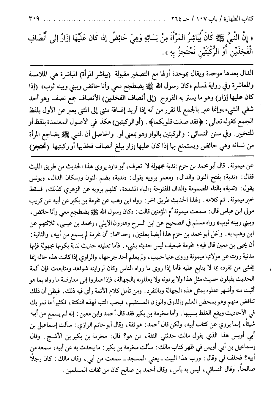 ولهذا الحديث طريق آخر رواه بن وَهْبٍ عَنْ مَخْرَمَةَ بْنِ بَكِيرٍ عَنْ أَبِيهِ عن كريب مولى بن عَبَّاسٍ قَالَ سَمِعْت مَيْمُونَةَ أُمَّ الْمُؤْمِنِينَ قَالَتْ كَانَ رَسُول اللَّه صَلَّى اللَّه عَلَيْهِ وَسَلَّمَ يَضْطَجِع مَعِي وَأَنَا حَائِض وَبَيْنِي وَبَيْنه ثَوْب رواه مسلم في الصحيح عن بن السَّرْحِ وَهَارُونَ الْأَيْلِيِّ وَمُحَمَّدِ بْنِ عِيسَى ثَلَاثَتهمْ عن بن وَهْبٍ بِهِ
