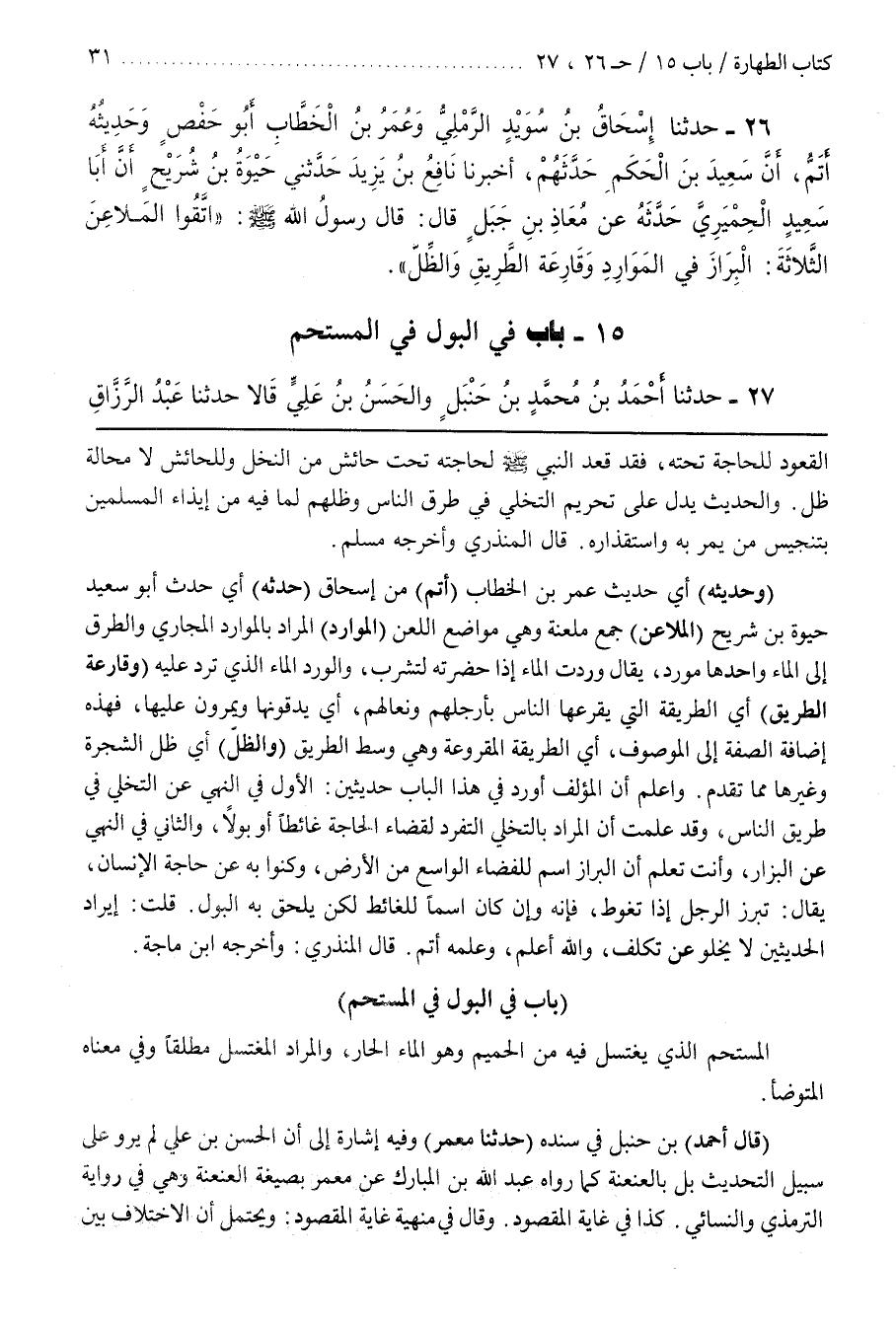 [26] (وَحَدِيثُهُ) أَيْ حَدِيثُ عُمَرَ بْنِ الْخَطَّابِ (أَتَمُّ) مِنْ إِسْحَاقَ (حَدَّثَهُ) أَيْ حَدَّثَ أَبُو سَعِيدٍ حَيْوَةَ بْنَ شُرَيْحٍ (الْمَلَاعِنَ) جَمْعُ مَلْعَنَةٍ وَهِيَ مَوَاضِعُ اللَّعْنِ (الْمَوَارِدِ) الْمُرَادُ بِالْمَوَارِدِ الْمَجَارِي وَالطُّرُقُ إِلَى الْمَاءِ وَاحِدُهَا مَوْرِدٌ يُقَالُ وَرَدْتَ الْمَاءَ إِذَا حَضَرْتَهُ لِتَشْرَبَ وَالْوِرْدُ الْمَاءُ الَّذِي تَرِدُ عَلَيْهِ (وَقَارِعَةِ الطَّرِيقِ) أَيِ الطَّرِيقَةُ الَّتِي يَقْرَعُهَا النَّاسُ بِأَرْجُلِهِمْ وَنِعَالِهِمْ أَيْ يَدُقُّونَهَا وَيَمُرُّونَ عَلَيْهَا فَهَذِهِ إِضَافَةُ الصِّفَةِ إِلَى الْمَوْصُوفِ أَيِ الطَّرِيقَةُ الْمَقْرُوعَةُ وَهِيَ وَسَطُ الطَّرِيقِ (وَالظِّلُّ) أَيْ ظِلُّ الشَّجَرَةِ وَغَيْرُهَا مِمَّا تَقَدَّمَ