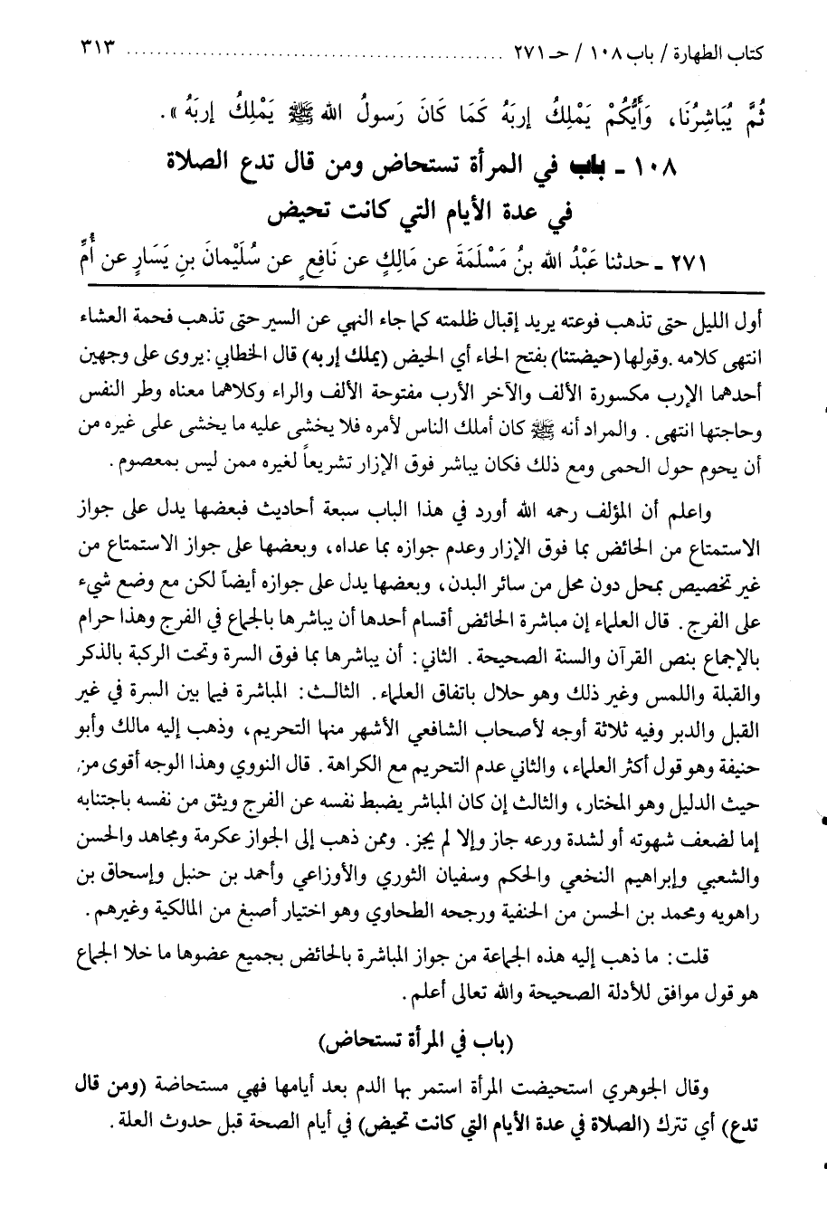 وَاعْلَمْ أَنَّ الْمُؤَلِّفَ رَحِمَهُ اللَّهُ أَوْرَدَ فِي هَذَا الْبَابِ سَبْعَةَ أَحَادِيثَ فَبَعْضُهَا يَدُلُّ عَلَى جَوَازِ الِاسْتِمْتَاعِ مِنَ الْحَائِضِ بِمَا فَوْقَ الْإِزَارِ وَعَدَمِ جَوَازِهِ بِمَا عَدَاهُ وَبَعْضُهَا عَلَى جَوَازِ الِاسْتِمْتَاعِ مِنْ غَيْرِ تَخْصِيصٍ بِمَحَلٍّ دُونَ مَحَلٍّ مِنْ سَائِرِ الْبَدَنِ وَبَعْضُهَا يَدُلُّ عَلَى جَوَازِهِ أَيْضًا لَكِنْ مَعَ وَضْعِ شَيْءٍ عَلَى الْفَرْجِ