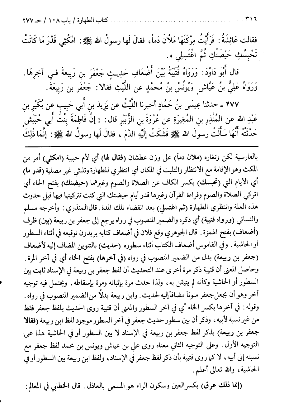 وَحَاصِلُ الْمَعْنَى أَنَّ قُتَيْبَةَ ذَكَرَ مَرَّةً أُخْرَى عِنْدَ التَّحْدِيثِ أَنَّ لَفْظَ جَعْفَرِ بْنِ رَبِيعَةَ فِي الْإِسْنَادِ ثَابِتٌ بَيْنَ السُّطُورِ أَوِ الْحَاشِيَةِ وَكَأَنَّهُ لَمْ يَتَيَقَّنْ بِهِ وَلِذَا حَدَّثَ مَرَّةً بِإِثْبَاتِهِ وَمَرَّةً بِإِسْقَاطِهِ وَيَحْتَمِلُ فِيهِ تَوْجِيهٌ آخَرُ وَهُوَ أَنْ يُجْعَلَ جَعْفَرٌ منونا مضافا إليه لحديث وبن رَبِيعَةَ بَدَلًا مِنَ الضَّمِيرِ الْمَنْصُوبِ فِي رَوَاهُ وَقَوْلُهُ فِي آخِرِهَا بِكَسْرِ الْخَاءِ أَيْ فِي آخِرِ السُّطُورِ وَالْمَعْنَى أَنَّ قُتَيْبَةَ رَوَى الْحَدِيثَ بِلَفْظِ جَعْفَرٍ فَقَطْ مِنْ غَيْرِ نِسْبَةٍ لِأَبِيهِ وَذَكَرَ أَنَّ بَيْنَ سُطُورِ حَدِيثِ جَعْفَرٍ فِي آخر السطور موجود لفظ بن رَبِيعَةَ (فَقَالَا جَعْفَرُ بْنُ رَبِيعَةَ) بِذِكْرِ لَفْظِ جَعْفَرِ بْنِ رَبِيعَةَ فِي الْإِسْنَادِ لَا بَيْنَ السُّطُورِ أَوْ فِي الْحَاشِيَةِ هَذَا عَلَى التَّوْجِيهِ الْأَوَّلِ
