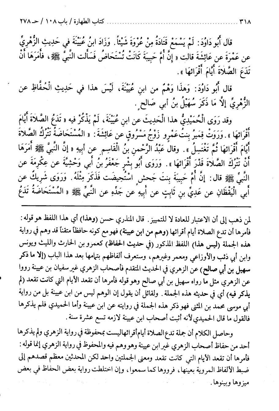 قَالَ الْمُنْذِرِيُّ حَسَنٌ (وَهَذَا) أَيْ هَذَا اللَّفْظُ وَهُوَ قَوْلُهُ فَأَمَرَهَا أَنْ تَدَعَ الصَّلَاةَ أَيَّامَ أقرائها (وهم من بن عُيَيْنَةَ) فَهُوَ مَعَ كَوْنِهِ حَافِظًا مُتْقِنًا قَدْ وَهِمَ فِي رِوَايَةِ هَذِهِ الْجُمْلَةِ (لَيْسَ هَذَا) اللَّفْظُ الْمَذْكُورُ (فِي حَدِيثِ الْحُفَّاظِ) كَعَمْرِو بْنِ الحارث والليث ويونس وبن أَبِي ذِئْبٍ وَالْأَوْزَاعِيِّ وَمَعْمَرٍ وَغَيْرِهِمْ وَسَتَعْرِفُ أَلْفَاظَهُمْ بِتَمَامِهَا بَعْدَ هَذَا الْبَابِ (إِلَّا مَا ذَكَرَ سُهَيْلُ بْنُ أَبِي صَالِحٍ) عَنِ الزُّهْرِيِّ فِي الْحَدِيثِ الْمُتَقَدِّمِ فَأَصْحَابُ الزُّهْرِيِّ غَيْرَ سُفْيَانِ بْنِ عُيَيْنَةَ رَوَاهُ عَنِ الزُّهْرِيِّ مِثْلَ مَا رَوَاهُ سُهَيْلُ بْنُ أَبِي صَالِحٍ وَهُوَ قَوْلُهُ فَأَمَرَهَا أَنْ تَقْعُدَ الْأَيَّامَ الَّتِي كَانَتْ تَقْعُدُ (لَمْ يَذْكُرْ فِيهِ) أَيْ فِي حَدِيثِهِ هَذِهِ الْجُمْلَةَ