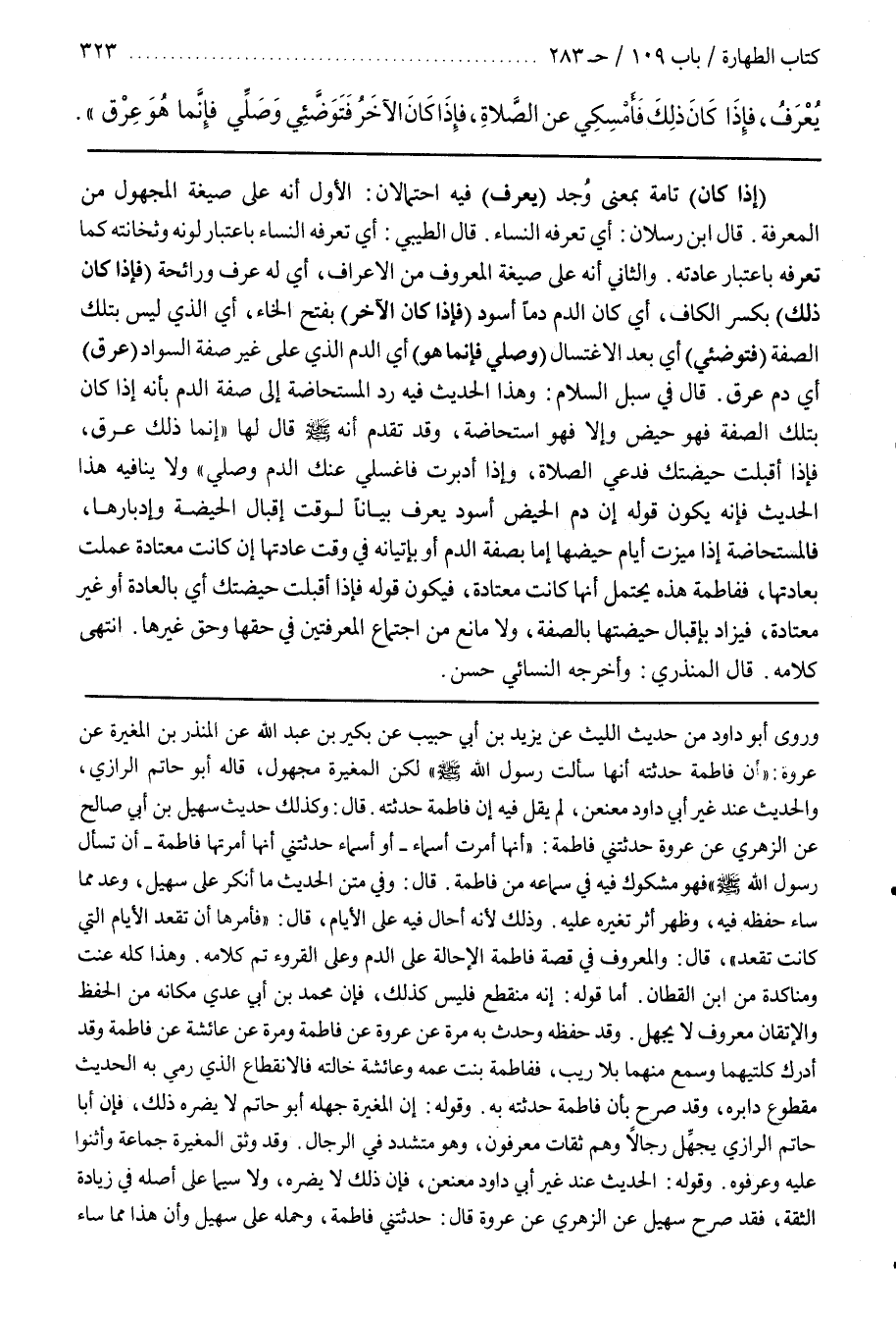 قَالَ فِي سُبُلِ السَّلَامِ وَهَذَا الحديث فهي رَدُّ الْمُسْتَحَاضَةِ إِلَى صِفَةِ الدَّمِ بِأَنَّهُ إِذَا كَانَ بِتِلْكَ الصِّفَةِ فَهُوَ حَيْضٌ وَإِلَّا فَهُوَ اسْتِحَاضَةٌ وَقَدْ تَقَدَّمَ أَنَّهُ صَلَّى اللَّهُ عَلَيْهِ وَسَلَّمَ قَالَ لَهَا إِنَّمَا ذَلِكَ عِرْقٌ فَإِذَا أَقْبَلَتْ حَيْضَتُكِ فَدَعِي الصَّلَاةَ وَإِذَا أَدْبَرَتْ فَاغْسِلِي عنك الدم وصلي ولاينافيه هَذَا الْحَدِيثُ فَإِنَّهُ يَكُونُ قَوْلُهُ إِنَّ دَمَ الْحَيْضِ أَسْوَدُ يُعْرَفُ بَيَانًا لِوَقْتِ إِقْبَالِ الْحَيْضَةِ وَإِدْبَارِهَا فَالْمُسْتَحَاضَةُ إِذَا مَيَّزَتْ أَيَّامَ حَيْضِهَا إِمَّا بِصِفَةِ الدَّمِ أَوْ بِإِتْيَانِهِ فِي وَقْتِ عَادَتِهَا إِنْ كَانَتْ مُعْتَادَةً عَمِلَتْ بِعَادَتِهَا فَفَاطِمَةُ هَذِهِ يُحْتَمَلُ أَنَّهَا كَانَتْ مُعْتَادَةً فَيَكُونُ قَوْلُهُ فَإِذَا أَقْبَلَتْ حَيْضَتُكِ أَيْ بِالْعَادَةِ أَوْ غَيْرَ مُعْتَادَةٍ فيزاد بإقبال حيضتها بالصفة وَلَا مَانِعَ مِنِ اجْتِمَاعِ الْمَعْرِفَتَيْنِ فِي حَقِّهَا وَحَقِّ غَيْرِهَا