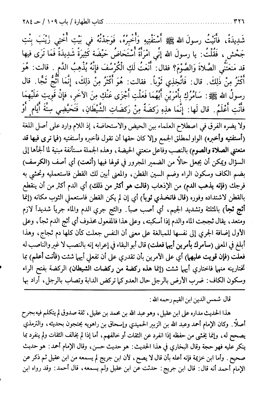 وَلَا يَضُرُّهُ الْفَرْقُ فِي اصْطِلَاحِ الْعُلَمَاءِ بَيْنَ الْحَيْضِ وَالِاسْتِحَاضَةِ إِذِ الْكَلَامُ وَارِدٌ عَلَى أَصْلِ اللغة (أستفتيه وأخبره) الواو المطلق الْجَمْعِ وَإِلَّا كَانَ حَقُّهَا أَنْ تَقُولَ فَأُخْبِرُهُ وَأَسْتَفْتِيهِ (فَمَا تَرَى فِيهَا قَدْ مَنَعَتْنِي الصَّلَاةَ وَالصَّوْمَ) بِالنَّصْبِ وَفَاعِلُ مَنَعَتْنِي الْحَيْضَةُ وَهَذِهِ الْجُمْلَةُ مستأنفة مبنية لِمَا أَلْجَأَهَا إِلَى السُّؤَالِ وَيُمْكِنُ أَنْ يُجْعَلَ حَالًا مِنَ الضَّمِيرِ الْمَجْرُورِ فِي قَوْلِهَا فِيهَا (أَنْعَتُ) أَيْ أَصِفُ (الْكُرْسُفَ) بِضَمِّ الْكَافِ وَسُكُونِ الرَّاءِ وَضَمِّ السِّينِ الْقُطْنُ وَالْمَعْنَى أُبَيِّنُ لَكِ القطن فاستعمليه وتحشي بِهِ فَرْجَكِ (فَإِنَّهُ يُذْهِبُ الدَّمَ) مِنَ الْإِذْهَابِ (قَالَتْ هُوَ أَكْثَرُ مِنْ ذَلِكَ) أَيِ الدَّمُ أَكْثَرُ مِنْ أَنْ يَنْقَطِعَ بِالْقُطْنِ لِاشْتِدَادِهِ وَفَوْرِهِ (قالت فَاتَّخِذِي ثَوْبًا) أَيْ إِنْ لَمْ يَكُنِ الْقُطْنُ فَاسْتَعْمِلِي الثَّوْبَ مَكَانَهُ (إِنَّمَا أَثُجُّ ثَجًّا) بِالْمُثَلَّثَةِ وَتَشْدِيدِ الْجِيمِ أَيْ أَصُبُّ صَبًّا