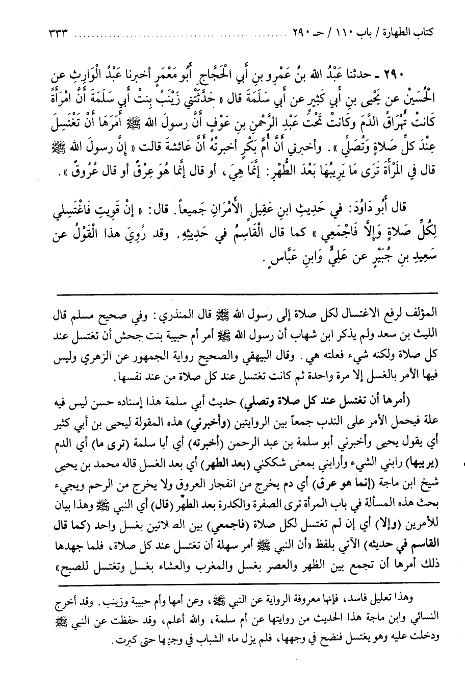 [293] (أَمَرَهَا أَنْ تَغْتَسِلَ عِنْدَ كُلِّ صَلَاةٍ وَتُصَلِّيَ) حَدِيثُ أَبِي سَلَمَةَ هَذَا إِسْنَادُهُ حَسَنٌ لَيْسَ فِيهِ عِلَّةٌ فَيُحْمَلُ الْأَمْرُ عَلَى النَّدْبِ جَمْعًا بَيْنَ الرِّوَايَتَيْنِ (وَأَخْبَرَنِي) هَذِهِ الْمَقُولَةُ لِيَحْيَى بْنُ أَبِي كَثِيرٍ أَيْ يَقُولُ يَحْيَى وَأَخْبَرَنِي أَبُو سَلَمَةَ بْنُ عَبْدِ الرَّحْمَنِ (أَخْبَرْتُهُ) أَيْ أَبَا سَلَمَةَ (تَرَى مَا) أَيِ الدَّمَ (يُرِيبُهَا) رَابَنِي الشَّيْءُ وَأَرَابَنِي بِمَعْنَى شَكَّكَنِي (بَعْدَ الطُّهْرِ) أَيْ بَعْدَ الْغُسْلِ قَالَهُ مُحَمَّدُ بن يحيى شيخ بن مَاجَهْ (إِنَّمَا هُوَ عِرْقٌ) أَيْ دَمٌ يَخْرُجُ مِنِ انْفِجَارِ الْعُرُوقِ وَلَا يَخْرُجُ مِنَ الرَّحِمِ وَيَجِيءُ بَحْثُ هَذِهِ الْمَسْأَلَةِ فِي بَابِ الْمَرْأَةُ تَرَى الصُّفْرَةَ وَالْكُدْرَةَ بَعْدَ الطُّهْرِ (قَالَ) أَيِ النَّبِيُّ صَلَّى اللَّهُ عَلَيْهِ وَسَلَّمَ وَهَذَا بَيَانٌ لِلْأَمْرَيْنِ (وَإِلَّا) أَيْ إِنْ لَمْ تَغْتَسِلْ لِكُلِّ صَلَاةٍ (فَاجْمَعِي) بَيْنَ الصَّلَاتَيْنِ بِغُسْلٍ وَاحِدٍ (كَمَا قَالَ الْقَاسِمُ فِي حَدِيثِهِ) الْآتِي بِلَفْظِ أَنَّ النَّبِيَّ صَلَّى اللَّهُ عَلَيْهِ وَسَلَّمَ أَمَرَ سَهْلَةَ أَنْ تَغْتَسِلَ عِنْدَ كُلِّ صَلَاةٍ فَلَمَّا جَهَدَهَا ذَلِكَ أَمَرَهَا أَنْ تَجْمَعَ بَيْنَ الظُّهْرِ وَالْعَصْرِ بِغُسْلٍ وَالْمَغْرِبِ وَالْعِشَاءِ بِغُسْلٍ وَتَغْتَسِلَ لِلصُّبْحِ