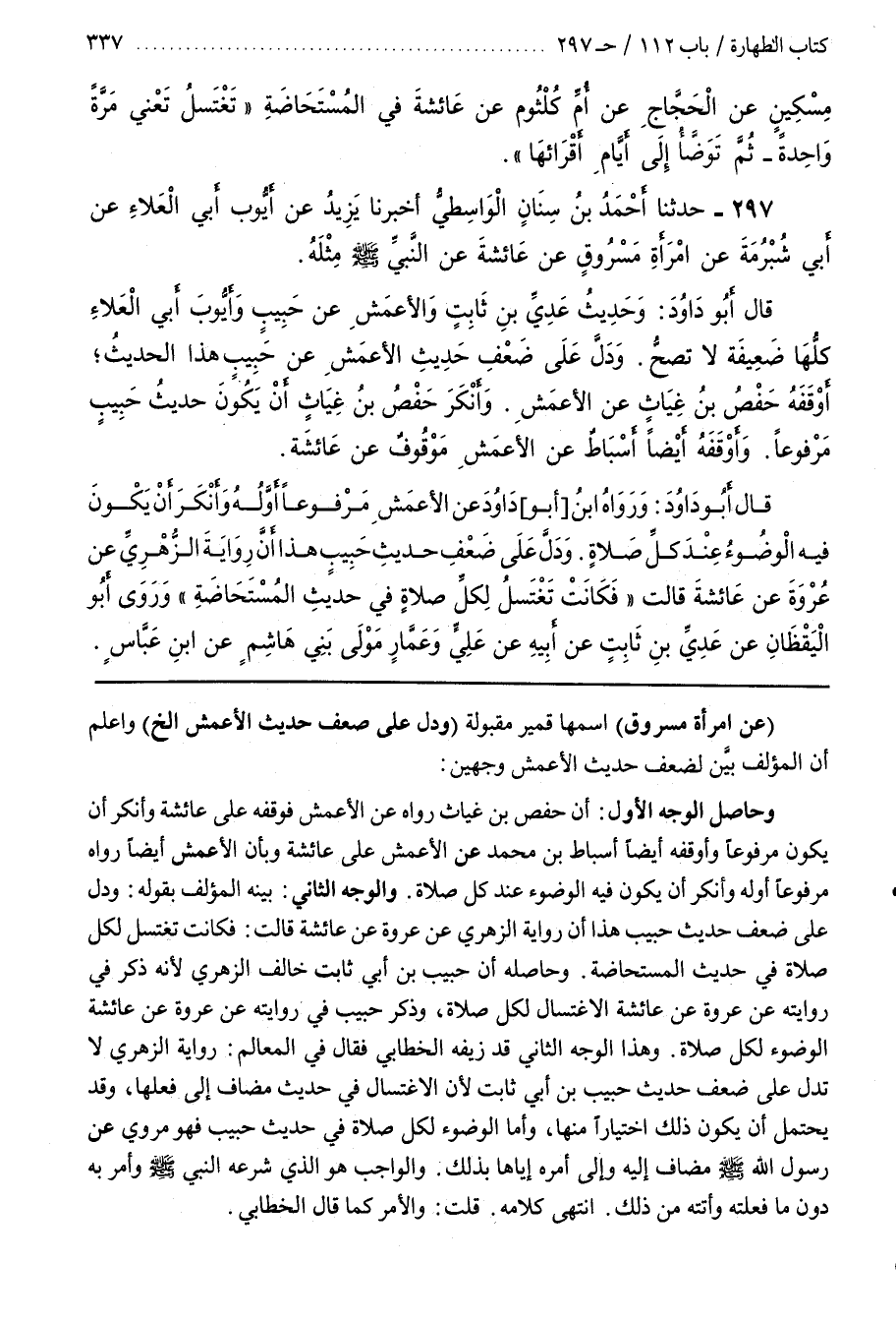 [300] (عَنِ امْرَأَةِ مَسْرُوقٍ) اسْمُهَا قُمَيْرٌ مَقْبُولَةٌ (وَدَلَّ عَلَى ضَعْفِ حَدِيثِ الْأَعْمَشِ إِلَخْ) وَاعْلَمْ أَنَّ الْمُؤَلِّفَ بَيَّنَ لِضَعْفِ حَدِيثِ الْأَعْمَشِ وَجْهَيْنِ وَحَاصِلُ الْوَجْهِ الْأَوَّلِ أَنَّ حَفْصَ بْنَ غِيَاثٍ رَوَاهُ عَنِ الْأَعْمَشِ فَوَقَفَهُ عَلَى عَائِشَةَ وَأَنْكَرَ أَنْ يَكُونَ مَرْفُوعًا وَأَوْقَفَهُ أَيْضًا أَسْبَاطُ بْنُ مُحَمَّدٍ عَنِ الْأَعْمَشِ عَلَى عَائِشَةَ وَبِأَنَّ الْأَعْمَشَ أَيْضًا رَوَاهُ مَرْفُوعًا أَوَّلُهُ وَأَنْكَرَ أَنْ يَكُونَ فِيهِ الْوُضُوءُ عِنْدَ كُلِّ صَلَاةٍ
