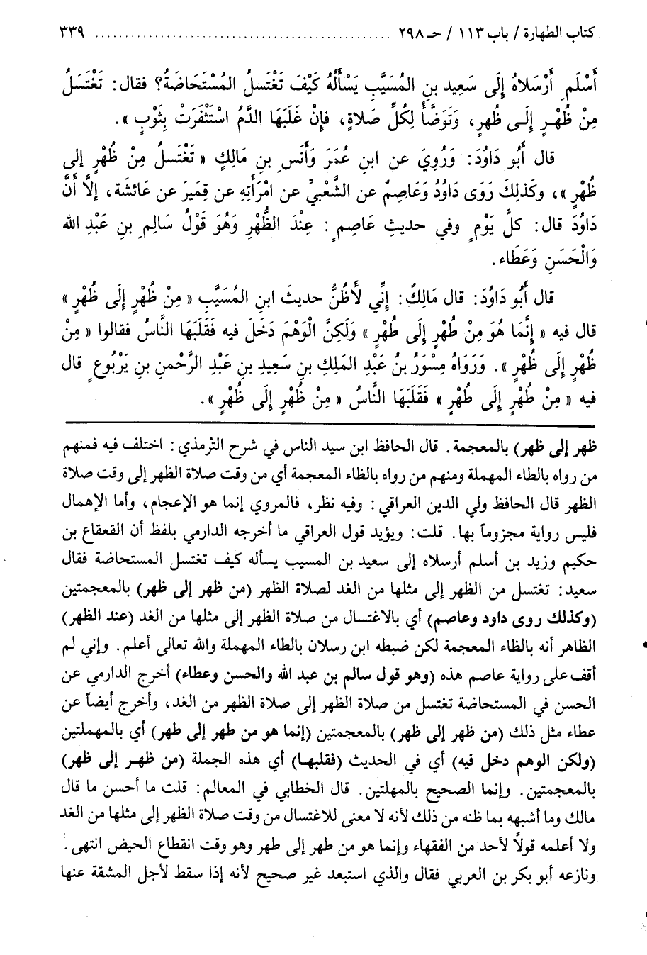 قُلْتُ وَيُؤَيِّدُ قَوْلَ الْعِرَاقِيِّ مَا أَخْرَجَهُ الدَّارِمِيُّ بِلَفْظِ إِنَّ الْقَعْقَاعَ بْنَ حَكِيمٍ وَزَيْدَ بْنَ أَسْلَمٍ أَرْسَلَاهُ إِلَى سَعِيدِ بْنِ الْمُسَيِّبِ يَسْأَلُهُ كَيْفَ تَغْتَسِلُ الْمُسْتَحَاضَةُ فَقَالَ سَعِيدٌ تَغْتَسِلُ مِنَ الظُّهْرِ إِلَى مِثْلِهَا مِنَ الْغَدِ لِصَلَاةِ الظُّهْرِ (مِنْ ظُهْرٍ إِلَى ظُهْرٍ) بِالْمُعْجَمَتَيْنِ (وَكَذَلِكَ رَوَى دَاوُدُ وَعَاصِمٌ) أَيْ بِالِاغْتِسَالِ مِنْ صَلَاةِ الظُّهْرِ إِلَى مِثْلِهَا مِنَ الْغَدِ (عِنْدَ الظُّهْرِ) الظاهر أنه بالظاء المعجمة لكن ضبطه بن رَسْلَانَ بِالطَّاءِ الْمُهْمَلَةِ وَاللَّهُ تَعَالَى أَعْلَمُ