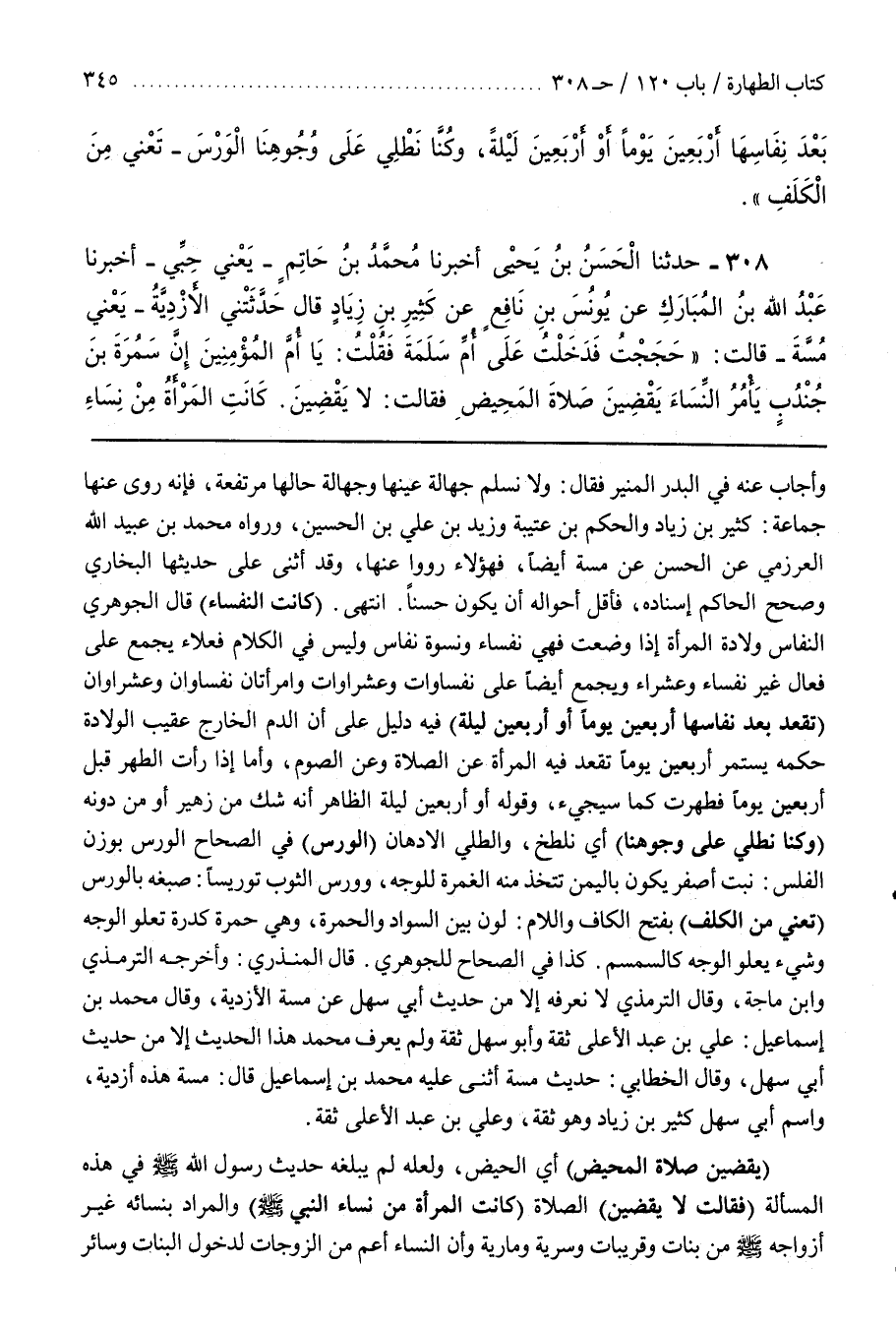انْتَهَى (كَانَتِ النُّفَسَاءُ) قَالَ الْجَوْهَرِيُّ النِّفَاسُ وِلَادَةُ الْمَرْأَةِ إِذَا وَضَعَتْ فَهِيَ نُفَسَاءُ وَنِسْوَةٌ نِفَاسٌ وَلَيْسَ فِي الْكَلَامِ فُعَلَاءُ يُجْمَعُ عَلَى فِعَالٍ غَيْرَ نُفَسَاءَ وَعُشَرَاءَ وَيُجْمَعُ أَيْضًا عَلَى نُفَسَاوَاتٍ وَعُشَرَوَاتٍ وَامْرَأَتَانِ نُفَسَاوَانِ وَعُشَرَاوَانِ (تَقْعُدُ بَعْدَ نِفَاسِهَا أَرْبَعِينَ يَوْمًا أَوْ أَرْبَعِينَ لَيْلَةً) فِيهِ دَلِيلٌ عَلَى أَنَّ الدَّمَ الْخَارِجَ عُقَيْبَ الْوِلَادَةِ حُكْمُهُ يَسْتَمِرُّ أَرْبَعِينَ يَوْمًا تَقْعُدُ فِيهِ الْمَرْأَةُ عَنِ الصَّلَاةِ وَعَنِ الصَّوْمِ وَأَمَّا إِذَا رَأَتِ الطُّهْرَ قَبْلَ أَرْبَعِينَ يَوْمًا فَطَهُرَتْ كَمَا سَيَجِيءُ وَقَوْلُهُ أَوْ أربعين ليلة الظاهر أنه شك من زهبر أَوْ مَنْ دُونَهُ (وَكُنَّا نَطْلِي عَلَى وُجُوهِنَا) أَيْ نُلَطِّخُ وَالطَّلْيُ الِادِّهَانُ (الْوَرْسَ) فِي الصِّحَاحِ الورس بوزن الفلس نبت أصفر يكون باليمنى تُتَّخَذُ مِنْهُ الْغُمْرَةُ لِلْوَجْهِ وَوَرَّسَ الثَّوْبَ تَوْرِيسًا صَبَغَهُ بِالْوَرْسِ (تَعْنِي مِنَ الْكَلَفِ) بِفَتْحِ الْكَافِ وَاللَّامِ لَوْنٌ بَيْنَ السَّوَادِ وَالْحُمْرَةِ وَهِيَ حُمْرَةُ كُدْرَةٍ تَعْلُو الْوَجْهَ وَشَيْءٌ يَعْلُو الْوَجْهَ كَالسِّمْسِمِ