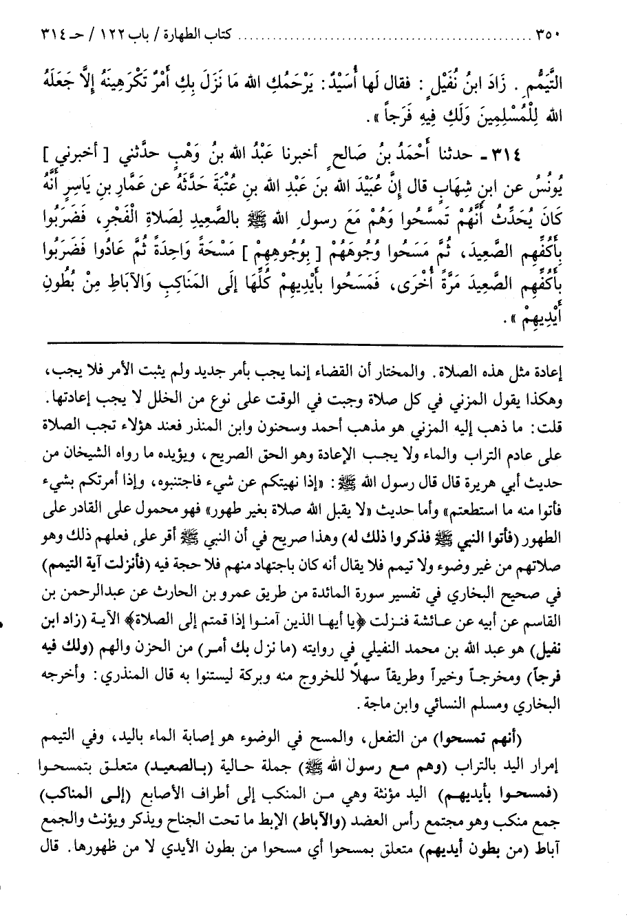 [318] (أَنَّهُمْ تَمَسَّحُوا) مِنَ التَّفَعُّلِ وَالْمَسْحُ فِي الْوُضُوءِ هُوَ إِصَابَةُ الْمَاءِ بِالْيَدِ وَفِي التَّيَمُّمِ إِمْرَارُ الْيَدِ بِالتُّرَابِ (وَهُمْ مَعَ رَسُولِ اللَّهِ صَلَّى اللَّهُ عَلَيْهِ وَسَلَّمَ) جُمْلَةٌ حَالِيَّةٌ (بِالصَّعِيدِ) مُتَعَلِّقٌ بِتَمَسَّحُوا (فَمَسَحُوا بِأَيْدِيهِمْ) الْيَدُ مُؤَنَّثَةٌ وَهِيَ مِنَ الْمَنْكِبِ إِلَى أَطْرَافِ الْأَصَابِعِ (إِلَى الْمَنَاكِبِ) جَمْعُ مَنْكِبٍ وَهُوَ مُجْتَمَعُ رَأْسِ الْعَضُدِ (وَالْآبَاطِ) الْإِبْطُ مَا تَحْتَ الْجَنَاحِ وَيُذَكَّرُ وَيُؤَنَّثُ وَالْجَمْعُ آبَاطٌ (مِنْ بُطُونِ أَيْدِيهِمْ) مُتَعَلِّقٌ بِمَسَحُوا أَيْ مَسَحُوا مِنْ بُطُونِ الْأَيْدِي لَا مِنْ ظُهُورِهَا