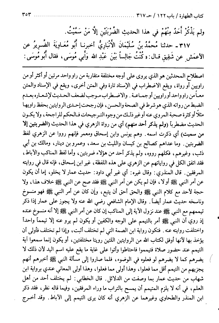 فَتَكُونُ رِوَايَةُ بن الصِّمَّةِ الَّتِي لَمْ تَخْتَلِفْ أَثْبَتَ وَإِذَا لَمْ تَخْتَلِفْ فَأَوْلَى أَنْ يُؤْخَذَ بِهَا لِأَنَّهَا أَوْفَقُ لِكِتَابِ اللَّهِ مِنَ الرِّوَايَتَيْنِ اللَّتَيْنِ رُوِيَتَا مُخْتَلِفَتَيْنِ أَوْ يَكُونُ إِنَّمَا سَمِعُوا آيَةَ التَّيَمُّمِ عِنْدَ حُضُورِ صَلَاةٍ فَتَيَمَّمُوا فَاحْتَاطُوا وَأَتَوْا عَلَى غَايَةِ مَا يَقَعُ عَلَيْهِ اسْمُ الْيَدِ لِأَنَّ ذَلِكَ لَا يَضُرُّهُمْ كَمَا لَا يَضُرُّهُمْ لَوْ فَعَلُوهُ فِي الْوُضُوءِ فَلَمَّا صَارُوا إِلَى مَسْأَلَةِ النَّبِيِّ صَلَّى اللَّهُ عَلَيْهِ وَسَلَّمَ أَخْبَرَهُمْ أَنَّهُمْ يَجْزِيهِمْ مِنَ التَّيَمُّمِ أَقَلُّ مِمَّا فَعَلُوا وَهَذَا أَوْلَى مِمَّا فَعَلُوا وَهَذَا أَوْلَى الْمَعَانِي عِنْدِي بِرِوَايَةِ بن شِهَابٍ مِنْ حَدِيثِ عَمَّارٍ بِمَا وَصَفْتُ مِنَ الدَّلَائِلِ