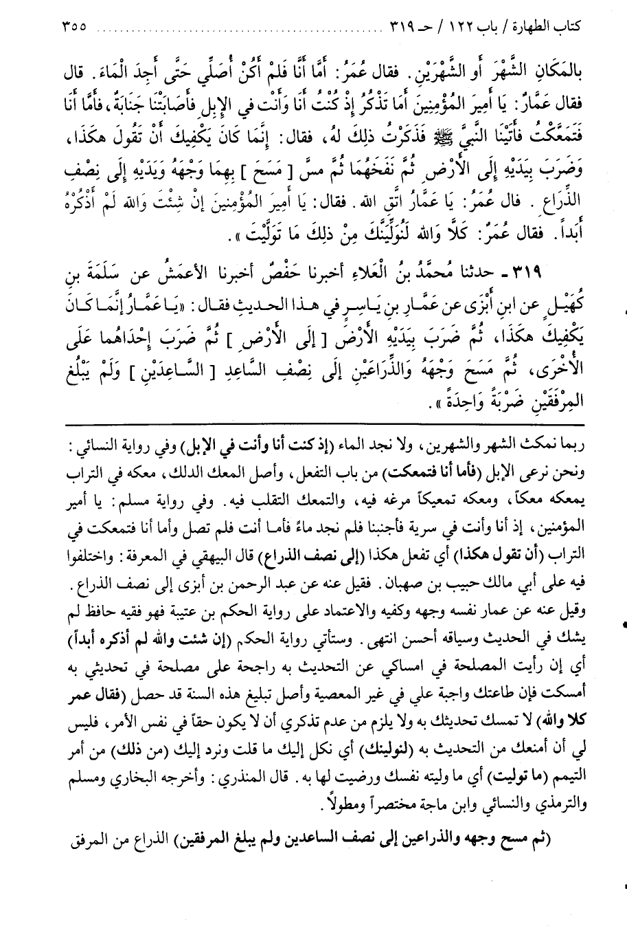 وَفِي رِوَايَةِ مُسْلِمٍ يَا أَمِيرَ الْمُؤْمِنِينَ إِذْ أَنَا وَأَنْتَ في سرية فأجنبنا فلم نجد ماءا فَأَمَّا أَنْتَ فَلَمْ تُصَلِّ وَأَمَّا أَنَا فَتَمَعَّكْتُ فِي التُّرَابِ (أَنْ تَقُولَ هَكَذَا) أَيْ تَفْعَلَ هَكَذَا (إِلَى نِصْفِ الذِّرَاعِ) قَالَ الْبَيْهَقِيُّ فِي الْمَعْرِفَةِ وَاخْتَلَفُوا فِيهِ عَلَى أَبِي حَبِيبِ بْنِ صَهْبَانَ