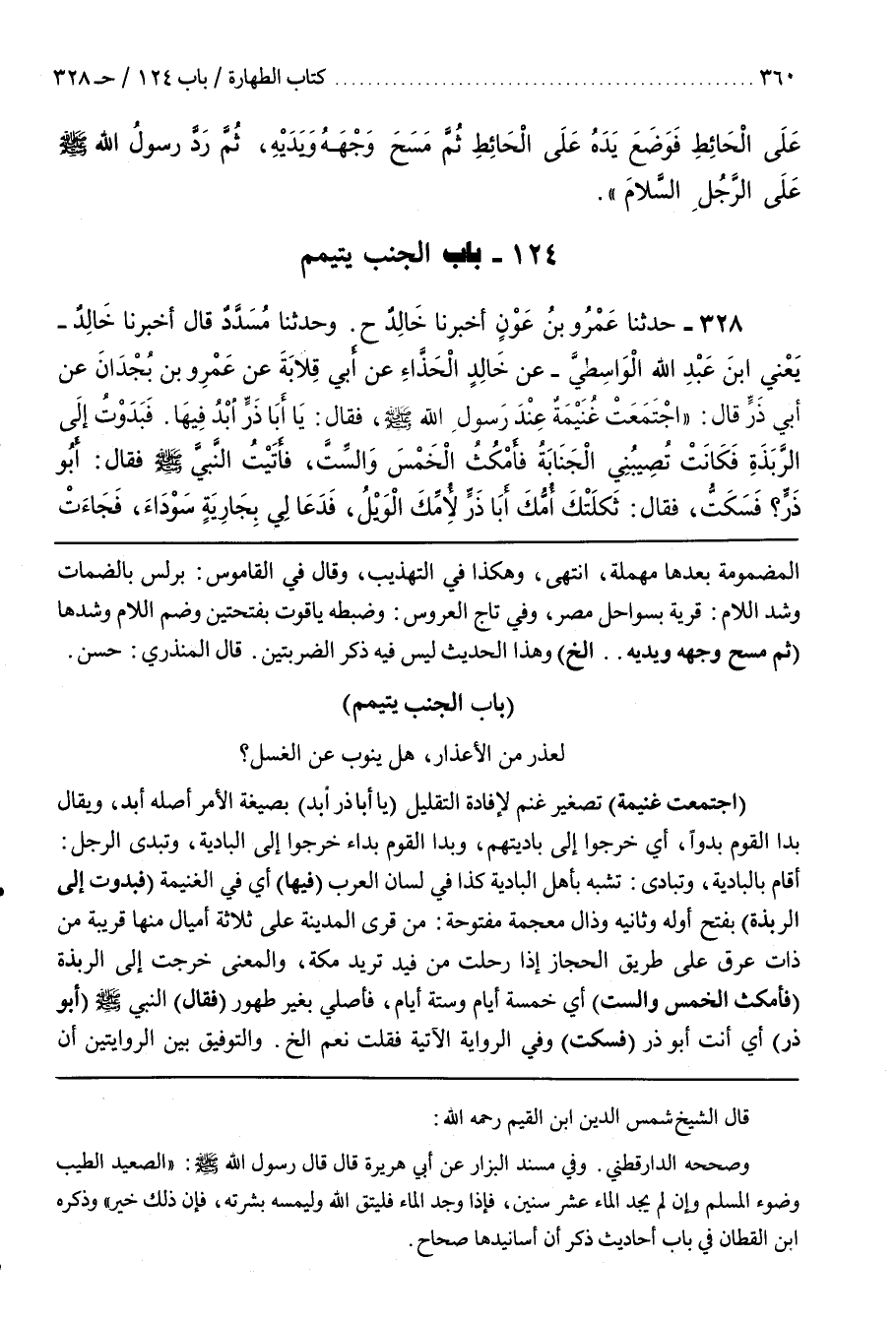 [332] (اجْتَمَعَتْ غُنَيْمَةٌ) تَصْغِيرُ غَنَمٍ لإفادة التقليل (ياأبا ذر أبد) بصيغة الأمر أصله أبدا وَيُقَالُ بَدَا الْقَوْمُ بَدْوًا أَيْ خَرَجُوا إِلَى بَادِيَتِهِمْ وَبَدَا الْقَوْمُ بَدَاءً خَرَجُوا إِلَى الْبَادِيَةِ وَتَبَدَّى الرَّجُلُ أَقَامَ بِالْبَادِيَةِ وَتَبَادَى تَشَبَّهَ بِأَهْلِ الْبَادِيَةِ كَذَا فِي لِسَانِ الْعَرَبِ (فِيهَا) أَيْ فِي الْغُنَيْمَةِ (فَبَدَوْتُ إِلَى الرَّبَذَةِ) بِفَتْحِ أَوَّلِهِ وَثَانِيهِ وَذَالٍ مُعْجَمَةٍ مَفْتُوحَةٍ مِنْ قُرَى الْمَدِينَةِ عَلَى ثَلَاثَةِ أَمْيَالٍ مِنْهَا قَرِيبَةٌ مِنْ ذَاتِ عِرْقٍ عَلَى طَرِيقِ الْحِجَازِ إِذَا رَحَلْتَ مِنْ قيد تُرِيدُ مَكَّةَ وَالْمَعْنَى خَرَجْتُ إِلَى الرَّبَذَةِ (فَأَمْكُثُ الْخَمْسَ وَالسِّتَّ) أَيْ خَمْسَةَ أَيَّامٍ وَسِتَّةَ أَيَّامٍ فَأُصَلِّي بِغَيْرِ طُهُورٍ (فَقَالَ) النَّبِيُّ صَلَّى اللَّهُ عَلَيْهِ وَسَلَّمَ (أَبُو ذَرٍّ) أَيْ أَنْتَ أَبُو ذَرٍّ (فَسَكَتَ) وَفِي الرِّوَايَةِ الْآتِيَةِ فَقُلْتُ نَعَمْ إِلَخْ