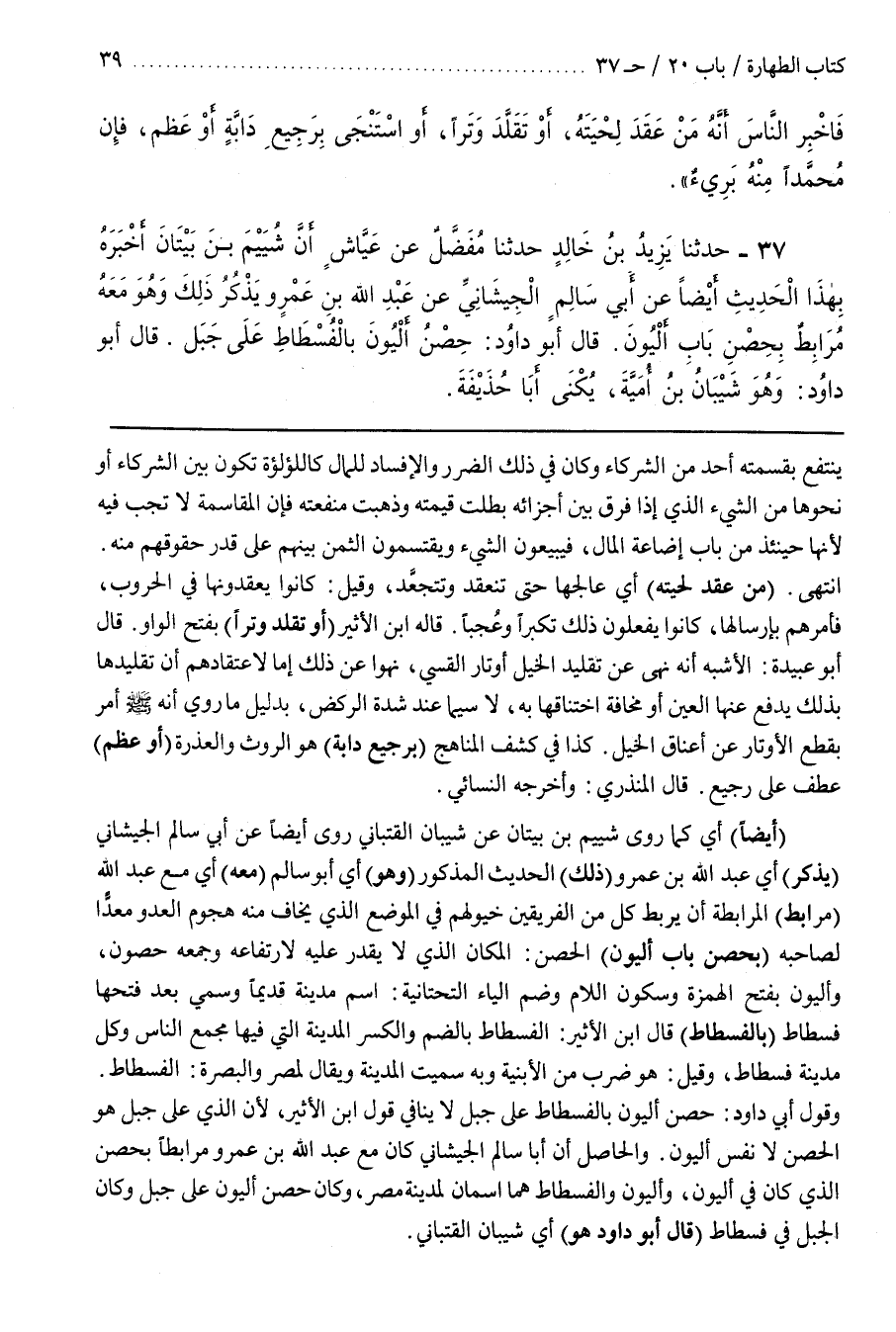 [37] (أَيْضًا) أَيْ كَمَا رَوَى شُيَيْمُ بْنُ بَيْتَانَ عَنْ شَيْبَانَ الْقِتْبَانِيِّ رَوَى أَيْضًا عَنْ أَبِي سَالِمٍ الْجَيْشَانِيِّ (يَذْكُرُ) أَيْ عَبْدُ اللَّهِ بْنُ عَمْرٍو (ذَلِكَ) الْحَدِيثَ الْمَذْكُورَ (وَهُوَ) أَيْ أَبُو سَالِمٍ (مَعَهُ) أَيْ مَعَ عَبْدِ اللَّهِ (مُرَابِطٌ) الْمُرَابَطَةُ أَنْ يَرْبِطَ كُلٌّ مِنَ الْفَرِيقَيْنِ خُيُولَهُمْ فِي الْمَوْضِعِ الَّذِي يُخَافُ مِنْهُ هُجُومُ الْعَدُوِّ مُعِدًّا لِصَاحِبِهِ (بِحِصْنِ بَابِ أَلْيُونَ) الْحِصْنُ الْمَكَانُ الَّذِي لَا يُقْدَرُ عَلَيْهِ لِارْتِفَاعِهِ وَجَمْعُهُ حُصُونٌ وَأَلْيُونَ بِفَتْحِ الْهَمْزَةِ وَسُكُونِ اللَّامِ وَضَمِّ الْيَاءِ التَّحْتَانِيَّةِ اسْمُ مَدِينَةٍ قَدِيمًا وَسُمِّيَتْ بَعْدَ فَتْحِهَا فسطاط (بالفسطاط) قال بن الْأَثِيرِ الْفُسْطَاطُ بِالضَّمِّ وَالْكَسْرِ الْمَدِينَةُ الَّتِي فِيهَا مَجْمَعُ النَّاسِ وَكُلُّ مَدِينَةٍ فُسْطَاطٌ وَقِيلَ هُوَ ضَرْبٌ مِنَ الْأَبْنِيَةِ وَبِهِ سُمِّيَتِ الْمَدِينَةُ وَيُقَالُ لِمِصْرَ وَالْبَصْرَةِ الْفُسْطَاطُ