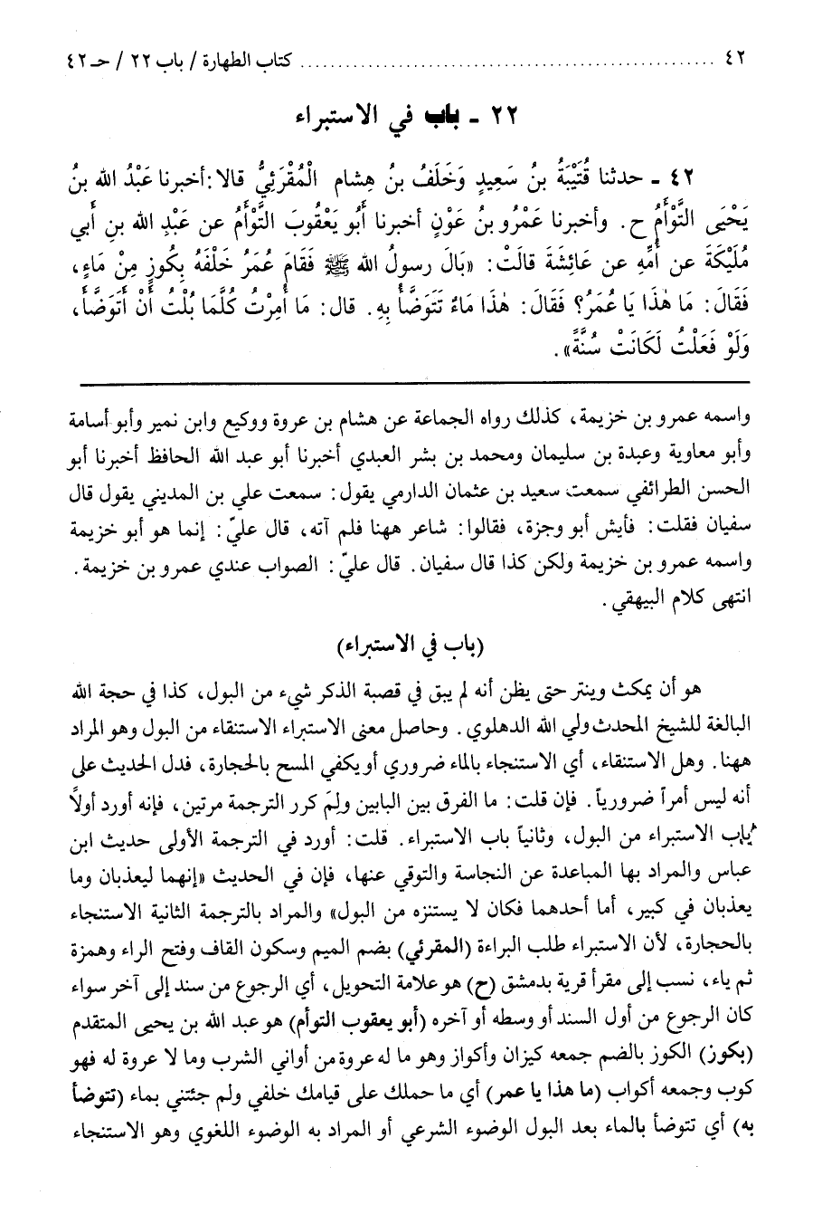 قُلْتُ أَوْرَدَ فِي التَّرْجَمَةِ الْأُولَى حديث بن عَبَّاسٍ وَالْمُرَادُ بِهَا الْمُبَاعَدَةُ عَنِ النَّجَاسَةِ وَالتَّوَقِّي عَنْهَا فَإِنَّ فِي الْحَدِيثِ إِنَّهُمَا لَيُعَذَّبَانِ وَمَا يُعَذَّبَانِ فِي كَبِيرٍ أَمَّا أَحَدُهُمَا فَكَانَ لَا يَسْتَنْزِهُ مِنَ الْبَوْلِ وَالْمُرَادُ بِالتَّرْجَمَةِ الثَّانِيَةِ الِاسْتِنْجَاءُ بالحجارة لأن الاستبراء طلب البراءة (المقرئ) بِضَمِّ الْمِيمِ وَسُكُونِ الْقَافِ وَفَتْحِ الرَّاءِ وَهَمْزَةٍ ثُمَّ يَاءٍ نُسِبَ إِلَى مُقْرَأٍ قَرْيَةٌ بِدِمَشْقَ هُوَ عَلَامَةُ التَّحْوِيلِ أَيِ الرُّجُوعُ مِنْ سَنَدٍ إِلَى آخَرَ سَوَاءٌ كَانَ الرُّجُوعُ مِنْ أَوَّلِ السَّنَدِ أَوْ وَسَطِهِ أَوْ آخِرِهِ (أَبُو يَعْقُوبَ التَّوْأَمُ) هُوَ عَبْدُ اللَّهِ بْنُ يَحْيَى الْمُتَقَدِّمُ (بِكُوزٍ) الْكُوزُ بِالضَّمِّ جَمْعُهُ كِيزَانٌ وَأَكْوَازٌ وَهُوَ ماله عروة من أواني الشرب وما لاعروة لَهُ فَهُوَ كُوبٌ وَجَمْعُهُ أَكْوَابٌ (مَا هَذَا يَا عُمَرُ) أَيْ مَا حَمَلَكَ عَلَى قِيَامِكَ خَلْفِي وَلِمَ جِئْتَنِي بِمَاءٍ (تَتَوَضَّأُ بِهِ) أَيْ تَتَوَضَّأُ بِالْمَاءِ بَعْدَ الْبَوْلِ الْوُضُوءَ الشَّرْعِيَّ أَوِ الْمُرَادُ بِهِ الْوُضُوءُ اللُّغَوِيُّ وَهُوَ الِاسْتِنْجَاءُ