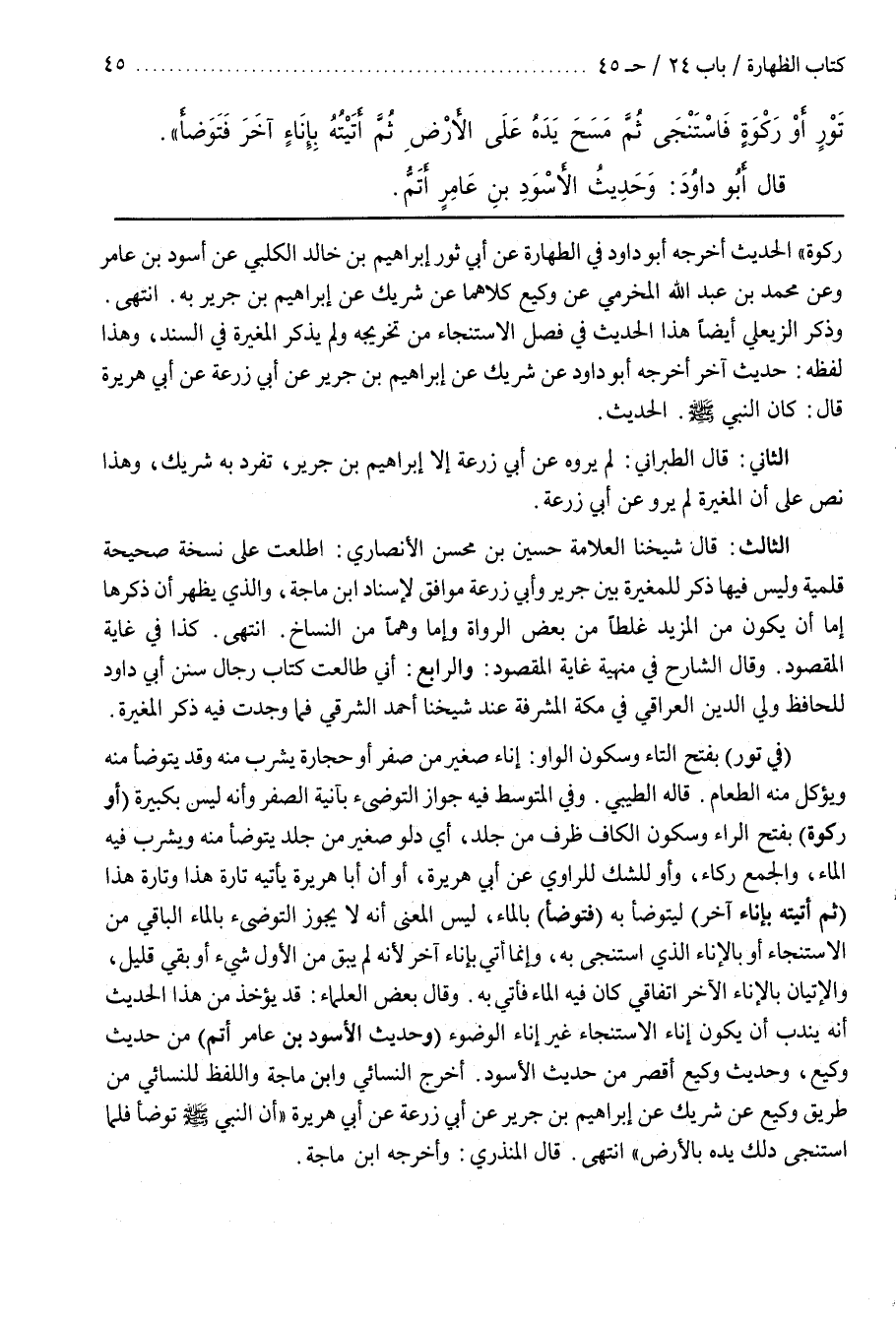 رَكْوَةٍ الْحَدِيثَ أَخْرَجَهُ أَبُو دَاوُدَ فِي الطَّهَارَةِ عَنْ أَبِي ثَوْرٍ إِبْرَاهِيمَ بْنِ خَالِدٍ الْكَلْبِيِّ عَنْ أَسْوَدَ بْنِ عَامِرٍ وَعَنْ مُحَمَّدِ بْنِ عَبْدِ اللَّهِ الْمَخْرَمِيِّ عَنْ وَكِيعٍ كِلَاهُمَا عَنْ شَرِيكٍ عَنْ إِبْرَاهِيمَ بْنِ جَرِيرٍ بِهِ