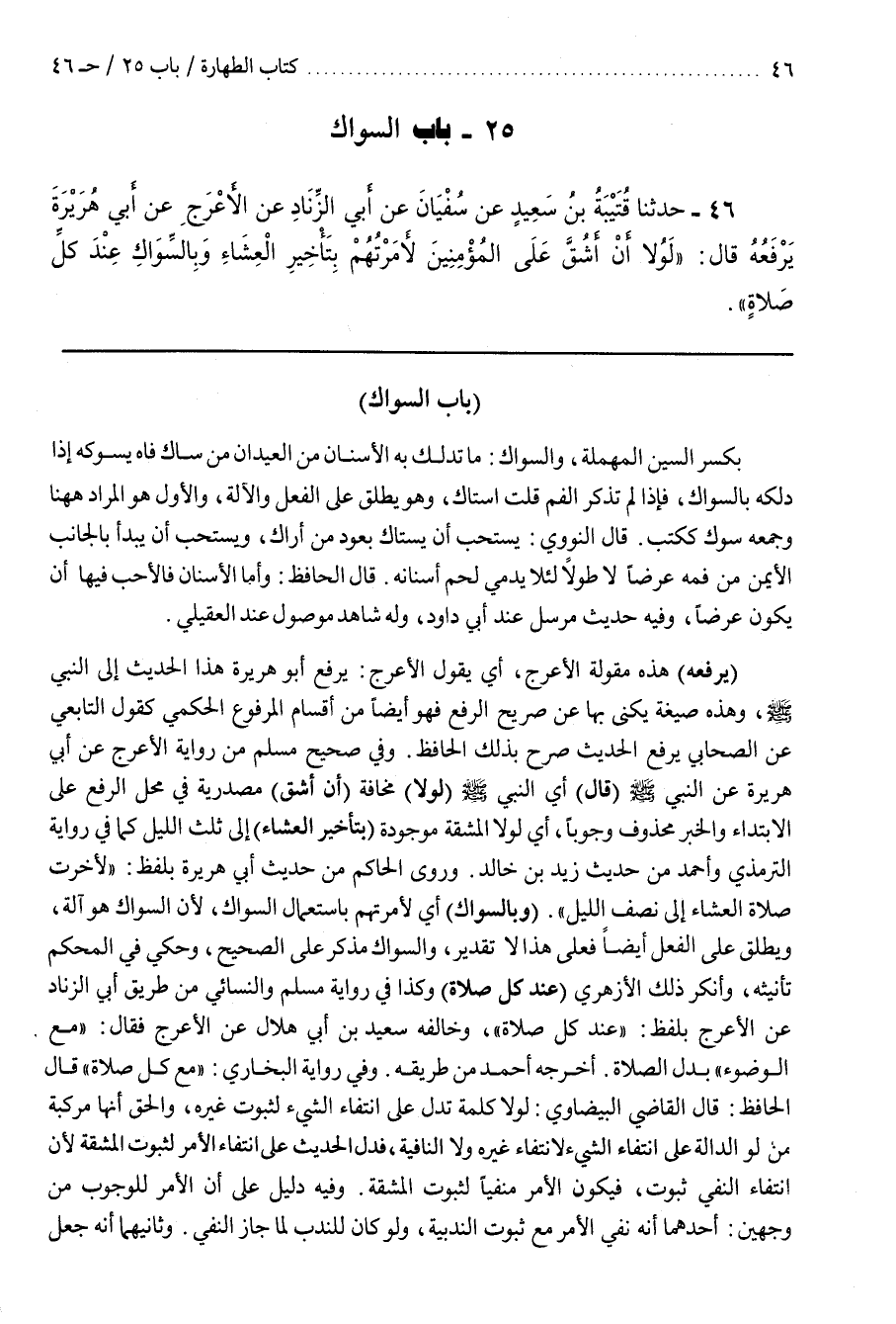 [46] بِكَسْرِ السِّينِ الْمُهْمَلَةِ وَالسِّوَاكُ مَا تُدْلَكُ بِهِ الْأَسْنَانُ مِنَ الْعِيدَانِ مِنْ سَاكَ فَاهُ يَسُوكُهُ إِذَا دَلَكَهُ بِالسِّوَاكِ فَإِذَا لَمْ تَذْكُرِ الْفَمَ قُلْتَ اسْتَاكَ وَهُوَ يُطْلَقُ عَلَى الفعل والآلة والأول هو المراد ها هنا وَجَمْعُهُ سُوُكٌ كَكُتُبٍ