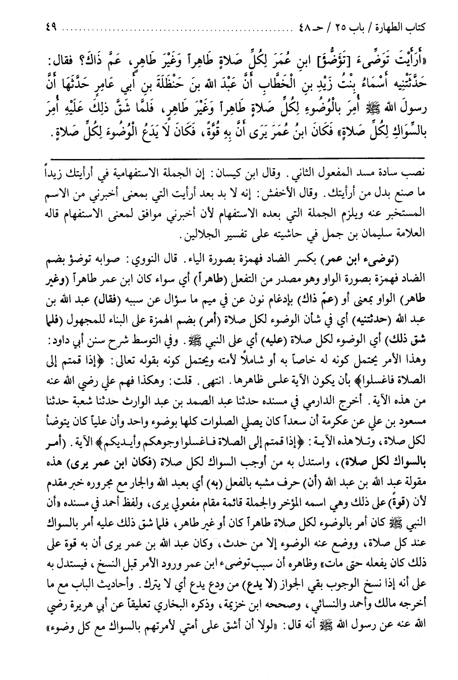 أَخْرَجَ الدَّارِمِيُّ فِي مُسْنَدِهِ حَدَّثَنَا عَبْدُ الصَّمَدِ بْنُ عَبْدِ الْوَارِثِ حَدَّثَنَا شُعْبَةُ حَدَّثَنَا مَسْعُودُ بْنُ عَلِيٍّ عَنْ عِكْرِمَةَ أَنَّ سَعْدًا كَانَ يُصَلِّي الصَّلَوَاتِ كُلَّهَا بِوُضُوءٍ وَاحِدٍ وَأَنَّ عَلِيًّا كَانَ يَتَوَضَّأُ لِكُلِّ صَلَاةٍ وَتَلَا هَذِهِ الْآيَةَ إِذَا قُمْتُمْ إِلَى الصَّلَاةِ فَاغْسِلُوا وُجُوهَكُمْ وَأَيْدِيَكُمْ الْآيَةَ (أُمِرَ بِالسِّوَاكِ لِكُلِّ صَلَاةٍ) وَاسْتَدَلَّ بِهِ من أوجب السواك لكل صلاة (فكان بن عُمَرَ يَرَى) هَذِهِ مَقُولَةُ عَبْدِ اللَّهِ بْنِ عَبْدِ اللَّهِ (أَنَّ) حَرْفٌ مُشَبَّهٌ بِالْفِعْلِ (بِهِ) أَيْ بِعَبْدِ اللَّهِ وَالْجَارُّ مَعَ مَجْرُورِهِ خَبَرٌ مُقَدَّمٌ لِأَنَّ (قُوَّةً) عَلَى ذَلِكَ وَهِيَ اسْمُهُ الْمُؤَخَّرُ وَالْجُمْلَةُ قَائِمَةٌ مَقَامَ مَفْعُولَيْ يَرَى وَلَفْظُ أَحْمَدَ فِي مُسْنَدِهِ أَنَّ النَّبِيَّ صَلَّى اللَّهُ عَلَيْهِ وَسَلَّمَ كَانَ أُمِرَ بِالْوُضُوءِ لِكُلِّ صَلَاةٍ طَاهِرًا كَانَ أَوْ غَيْرَ طَاهِرٍ فَلَمَّا شَقَّ ذَلِكَ عَلَيْهِ أُمِرَ بِالسِّوَاكِ عِنْدَ كُلِّ صَلَاةٍ وَوُضِعَ عَنْهُ الْوُضُوءُ إِلَّا مِنْ حَدَثٍ وَكَانَ عَبْدُ اللَّهِ بْنُ عُمَرَ يَرَى أَنَّ بِهِ قُوَّةً عَلَى ذَلِكَ كَانَ يَفْعَلُهُ حَتَّى مَاتَ وظاهره أن سبب توضىء بن عُمَرَ وُرُودُ الْأَمْرِ قَبْلَ النَّسْخِ فَيُسْتَدَلُّ بِهِ عَلَى أَنَّهُ إِذَا نُسِخَ الْوُجُوبُ بَقِيَ الْجَوَازُ (لَا يَدَعُ) مِنْ وَدَعَ يَدَعُ أَيْ لَا يَتْرُكُ