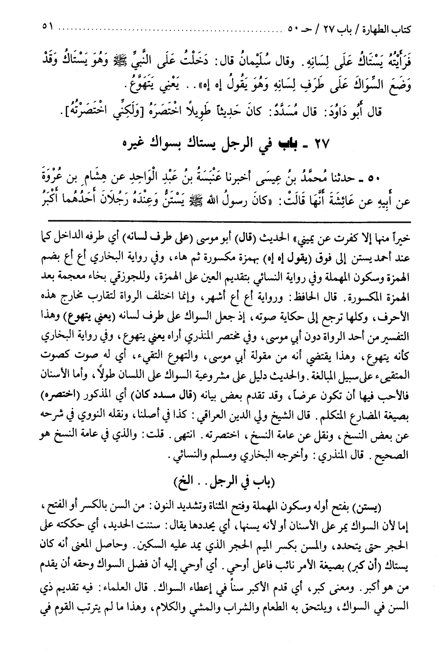 وَالْحَدِيثُ دَلِيلٌ عَلَى مَشْرُوعِيَّةِ السِّوَاكِ عَلَى اللِّسَانِ طُولًا وَأَمَّا الْأَسْنَانُ فَالْأَحَبُّ فِيهَا أَنْ تَكُونَ عَرْضًا وَقَدْ تَقَدَّمَ بَعْضُ بَيَانِهِ (قَالَ مُسَدَّدٌ كَانَ) أَيِ الْمَذْكُورُ (اخْتَصَرَهُ) بِصِيغَةِ الْمُضَارِعِ الْمُتَكَلِّمَ