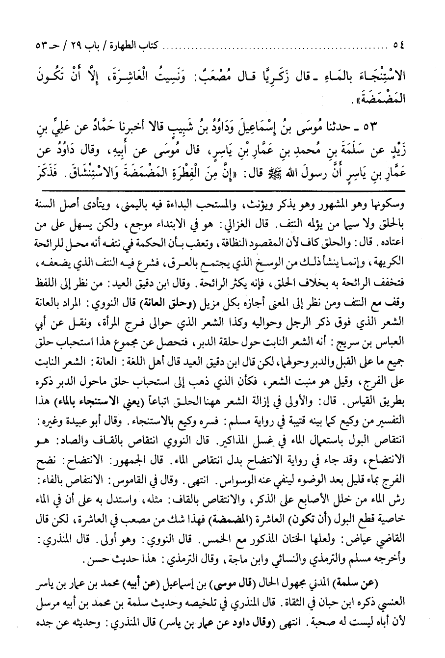 قَالَ وَالْأَوْلَى في إزالة الشعر ها هنا الْحَلْقُ اتِّبَاعًا (يَعْنِي الِاسْتِنْجَاءَ بِالْمَاءِ) هَذَا التَّفْسِيرُ مِنْ وَكِيعٍ كَمَا بَيَّنَهُ قُتَيْبَةُ فِي رِوَايَةِ مُسْلِمٍ فَسَّرَهُ وَكِيعٌ بِالِاسْتِنْجَاءِ