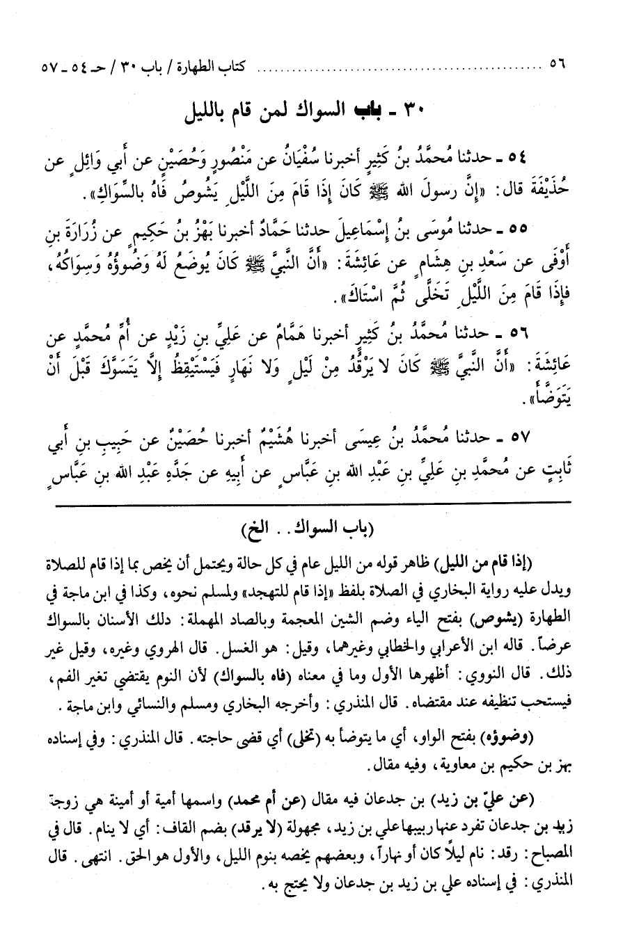[55] إلخ (إِذَا قَامَ مِنَ اللَّيْلِ) ظَاهِرُ قَوْلِهِ مِنَ اللَّيْلِ عَامٌّ فِي كُلِّ حَالَةٍ وَيَحْتَمِلُ أَنْ يُخَصَّ بِمَا إِذَا قَامَ لِلصَّلَاةِ وَيَدُلُّ عَلَيْهِ رِوَايَةُ الْبُخَارِيِّ فِي الصَّلَاةِ بِلَفْظِ إِذَا قَامَ للتهجد ولمسلم نحوه وكذا في بن مَاجَهْ فِي الطَّهَارَةِ (يَشُوصُ) بِفَتْحِ الْيَاءِ وَضَمِّ الشِّينِ الْمُعْجَمَةِ وَبِالصَّادِ الْمُهْمَلَةِ دَلْكُ الْأَسْنَانِ بِالسِّوَاكِ عرضا