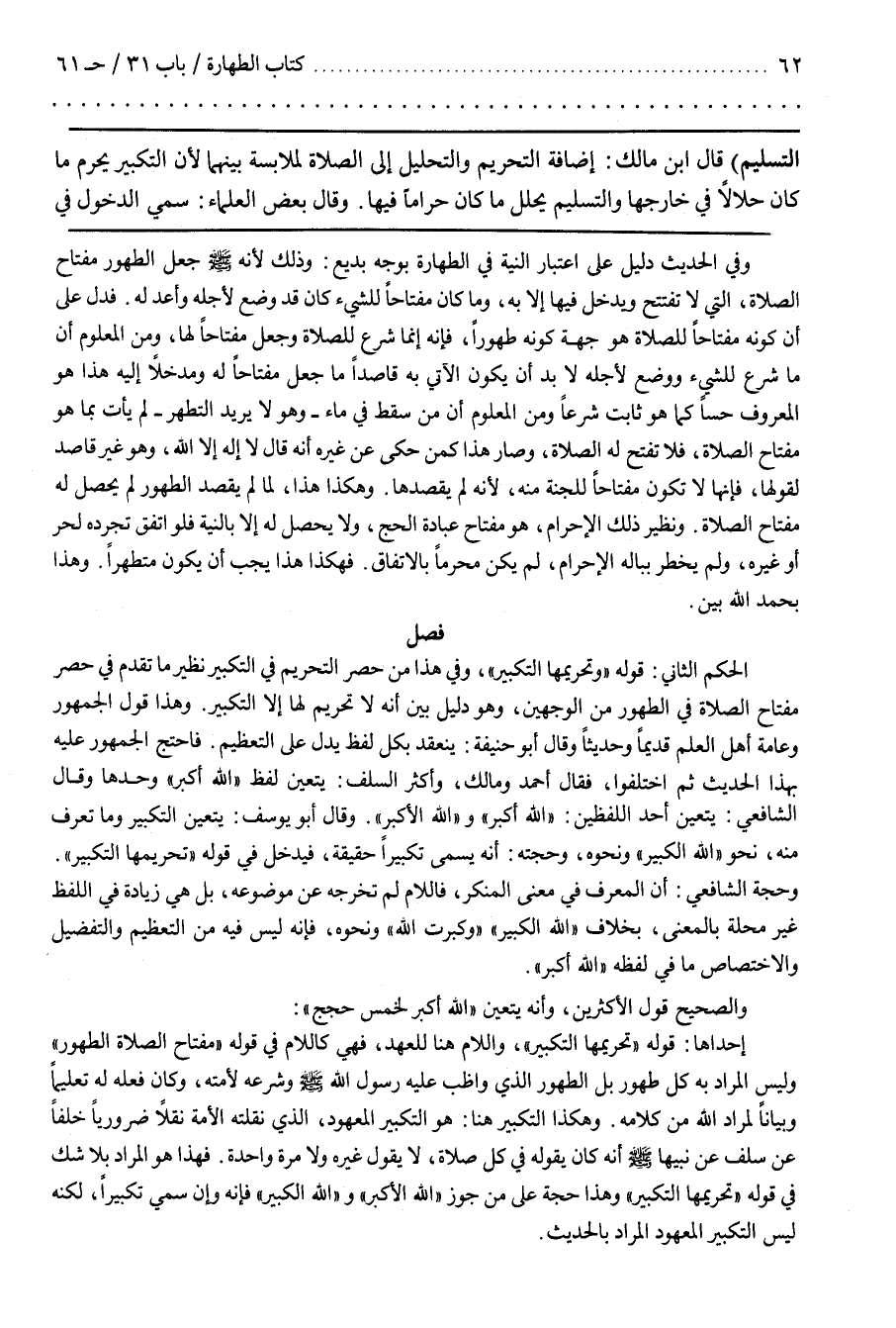 فَصْلٌ الْحُكْم الثَّانِي قَوْله وَتَحْرِيمهَا التَّكْبِير وَفِي هَذَا مِنْ حَصْر التَّحْرِيم فِي التَّكْبِير نَظِير مَا تَقَدَّمَ فِي حَصْر مِفْتَاح الصَّلَاة فِي الطَّهُور مِنْ الْوَجْهَيْنِ وَهُوَ دَلِيل بَيِّن أَنَّهُ لَا تَحْرِيم لَهَا إِلَّا التَّكْبِير