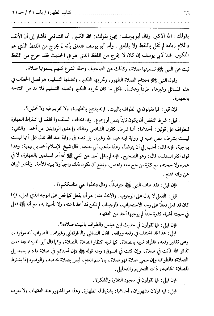 وَقَدْ اِخْتَلَفَ السَّلَف وَالْخَلَف فِي اِشْتِرَاط الطَّهَارَة لِلطَّوَافِ عَلَى قَوْلَيْنِ أَحَدهمَا أَنَّهَا شَرْط كَقَوْلِ الشَّافِعِيّ وَمَالِكٍ وَإِحْدَى الرِّوَايَتَيْنِ عَنْ أَحْمَدَ