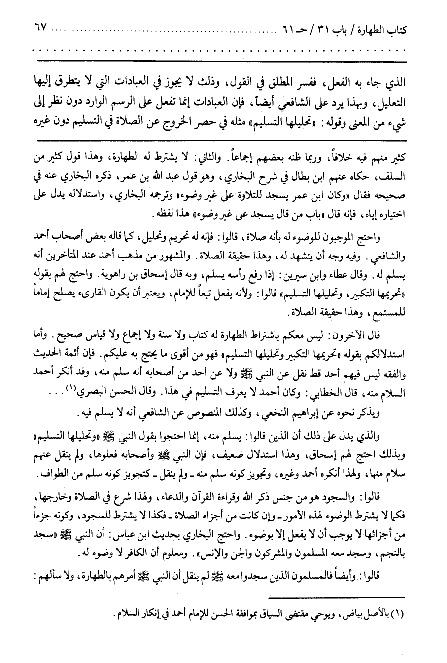 وَاَلَّذِي يَدُلّ عَلَى ذَلِكَ أَنَّ الَّذِينَ قَالُوا يُسَلَّم مِنْهُ إِنَّمَا اِحْتَجُّوا بقول النبي وَتَحْلِيلهَا التَّسْلِيم وَبِذَلِكَ اِحْتَجَّ لَهُمْ إِسْحَاقُ وَهَذَا استدلال ضعيف فإن النبي وَأَصْحَابه فَعَلُوهَا وَلَمْ يُنْقَل عَنْهُمْ سَلَام مِنْهَا وَلِهَذَا أَنْكَرَهُ أَحْمَدُ وَغَيْره وَتَجْوِيز كَوْنه سَلَّمَ مِنْهُ وَلَمْ يُنْقَل كَتَجْوِيزِ كَوْنه سَلَّمَ مِنْ الطَّوَاف