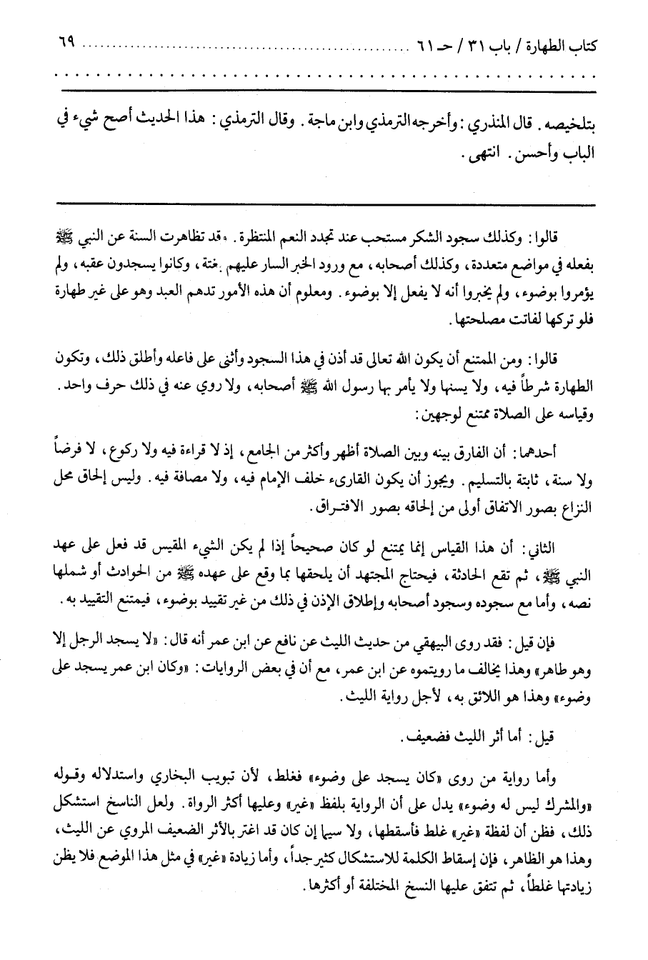 الثَّانِي أَنَّ هَذًّا الْقِيَاس إِنَّمَا يَمْتَنِع لَوْ كَانَ صَحِيحًا إِذَا لَمْ يَكُنْ الشَّيْء الْمَقِيس قَدْ فُعِلَ عَلَى عَهْد النبي ثُمَّ تَقَع الْحَادِثَة فَيَحْتَاج الْمُجْتَهِد أَنْ يُلْحِقهَا بما وقع على عهده مِنْ الْحَوَادِث أَوْ شَمِلَهَا نَصّه وَأَمَّا مَعَ سُجُوده وَسُجُود أَصْحَابه وَإِطْلَاق الْإِذْن فِي ذَلِكَ مِنْ غَيْر تَقْيِيد بِوُضُوءٍ فَيَمْتَنِع التَّقْيِيد بِهِ
