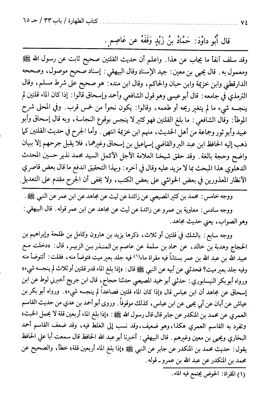 وَوَجْه سَابِع بِالشَّكِّ فِي قُلَّتَيْنِ أَوْ ثَلَاث ذَكَرَهَا يَزِيدُ بْنُ هَارُونَ وَكَامِلُ بْنُ طَلْحَةَ وَإِبْرَاهِيمُ بْنُ الْحَجَّاجِ وَهُدْبَةُ بْنُ خَالِدٍ عَنْ حَمَّادِ بْنِ سَلَمَةَ عَنْ عَاصِمِ بْنِ الْمُنْذِرِ بْنِ الزُّبَيْرِ قَالَ دَخَلْت مَعَ عُبَيْدِ اللَّهِ بْنِ عَبْدِ اللَّهِ بْنِ عُمَرَ بُسْتَانًا فِيهِ مِقْرَاةُ مَاء (1) فِيهِ جِلْد بَعِير مَيِّت فَتَوَضَّأَ مِنْهُ فَقُلْت أَتَتَوَضَّأُ مِنْهُ وَفِيهِ جِلْد بَعِير مَيِّت فَحَدَّثَنِي عَنْ أَبِيهِ عَنْ النبي قَالَ إِذَا بَلَغَ الْمَاء قَدْر قُلَّتَيْنِ أَوْ ثَلَاث لَمْ يُنَجِّسهُ شَيْء وَرَوَاهُ أَبُو بَكْرٍ النَّيْسَابُورِيُّ حَدَّثَنِي أَبُو حُمَيْدٍ الْمِصِّيصِيُّ حَدَّثْنَا حَجَّاجٌ قال بن جريج أخبرني لوط عن بن إسحاق عن مجاهد أن بن عَبَّاسٍ قَالَ إِذَا كَانَ الْمَاء قُلَّتَيْنِ فَصَاعِدًا لَمْ يُنَجِّسهُ شَيْء