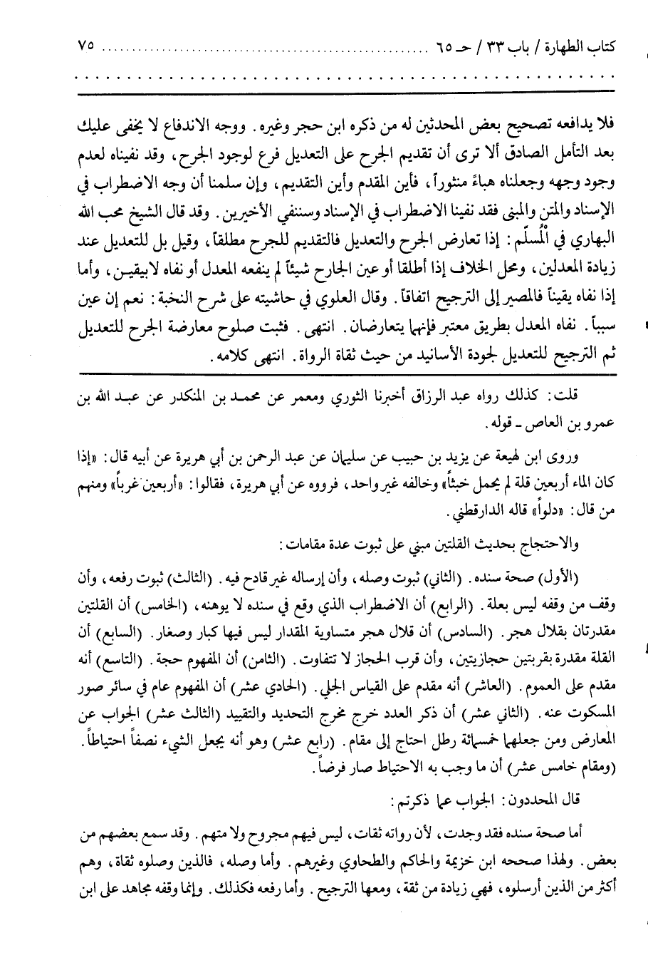 وَالِاحْتِجَاج بِحَدِيثِ الْقُلَّتَيْنِ مَبْنِيّ عَلَى ثُبُوت عِدَّة مَقَامَات (الْأَوَّل) صِحَّة سَنَده