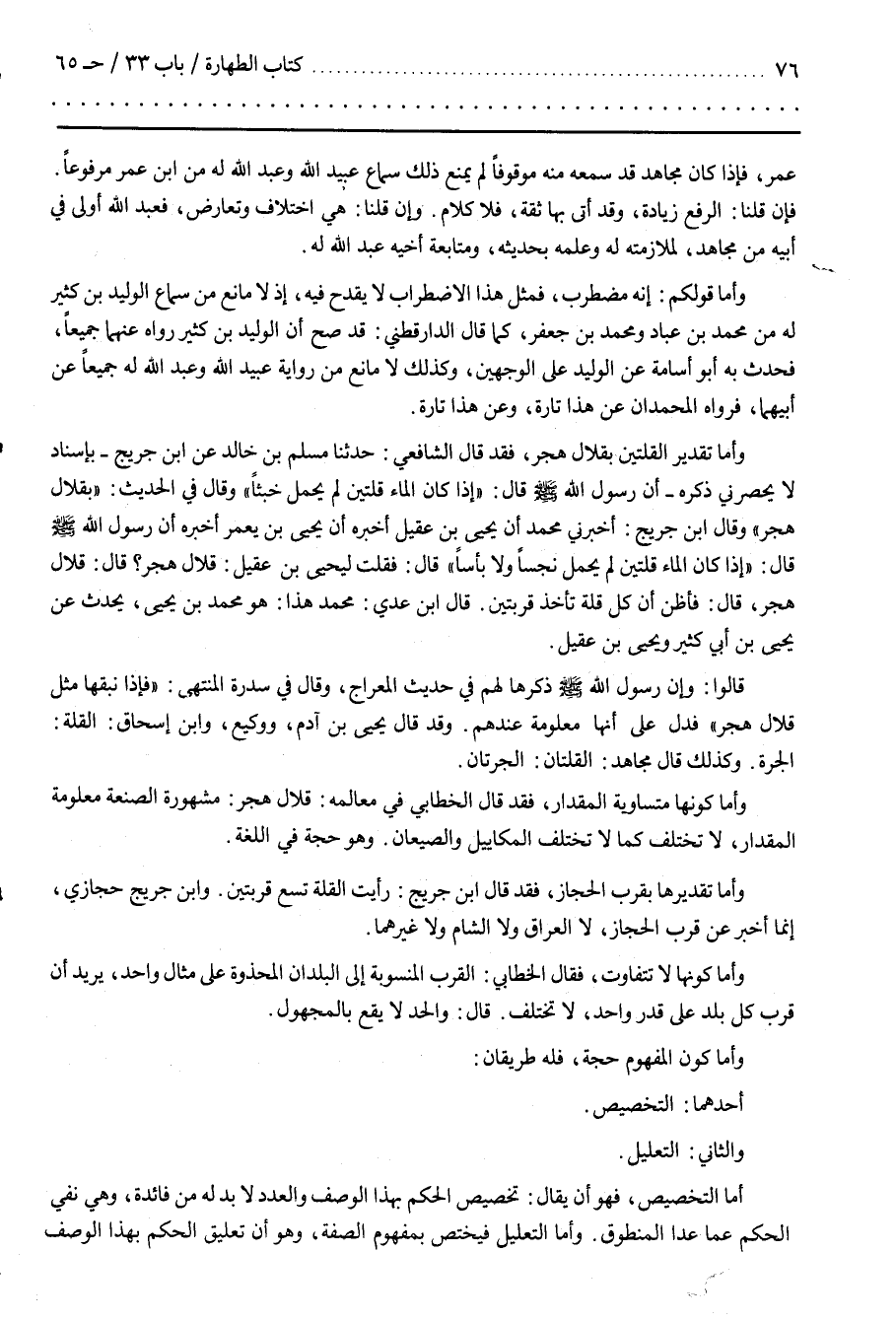 وَأَمَّا تَقْدِير الْقُلَّتَيْنِ بِقِلَالِ هَجَرَ فَقَدْ قَالَ الشَّافِعِيُّ حَدَّثَنَا مسلم بن خالد عن بن جُرَيْجٍ بِإِسْنَادٍ لَا يَحْضُرنِي ذِكْره أَنَّ رَسُول الله قَالَ إِذَا كَانَ الْمَاء قُلَّتَيْنِ لَمْ يَحْمِل خَبَثًا وَقَالَ فِي الْحَدِيث بِقِلَالِ هَجَرَ وَقَالَ بن جُرَيْجٍ أَخْبَرَنِي مُحَمَّدُ أَنَّ يَحْيَى بْنَ عُقَيْلٍ أَخْبَرَهُ أَنَّ يَحْيَى بْنَ يَعْمُرَ أَخْبَرَهُ أَنَّ رسول الله قَالَ إِذَا كَانَ الْمَاء قُلَّتَيْنِ لَمْ يَحْمِل نَجَسًا وَلَا بَأْسًا قَالَ فَقُلْت لِيَحْيَى بْنِ عُقَيْلٍ قِلَال هَجَرَ قَالَ قِلَال هَجَرَ قَالَ فَأَظُنّ أَنَّ كُلّ قُلَّة تَأْخُذ قِرْبَتَيْنِ