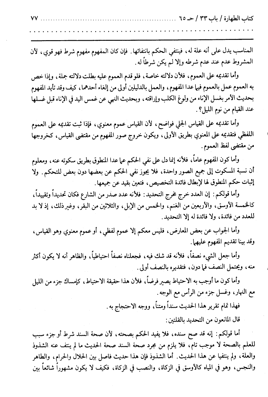 وَأَمَّا الْجَوَاب عَنْ بَعْض الْمُعَارِض فَلَيْسَ مَعَكُمْ إِلَّا عُمُوم لَفْظِيّ أَوْ عُمُوم مَعْنَوِيّ وَهُوَ الْقِيَاس وَقَدْ بَيَّنَّا تَقْدِيم الْمَفْهُوم عَلَيْهِمَا