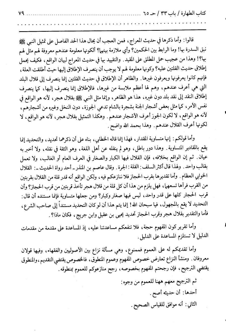 وَالتَّقْيِيد بِهَا فِي حَدِيث الْمِعْرَاج لِبَيَانِ الْوَاقِع فَكَيْف يُحْمَل إِطْلَاق حَدِيث الْقُلَّتَيْنِ عَلَيْهِ وَكَوْنهَا مَعْلُومَة لَهُمْ لَا يُوجِب أَنْ يَنْصَرِف الْإِطْلَاق إِلَيْهَا حَيْثُ أُطْلِقَتْ الْعِلَّة فَإِنَّهُمْ كَانُوا يَعْرِفُونَهَا وَيَعْرِفُونَ غَيْرهَا