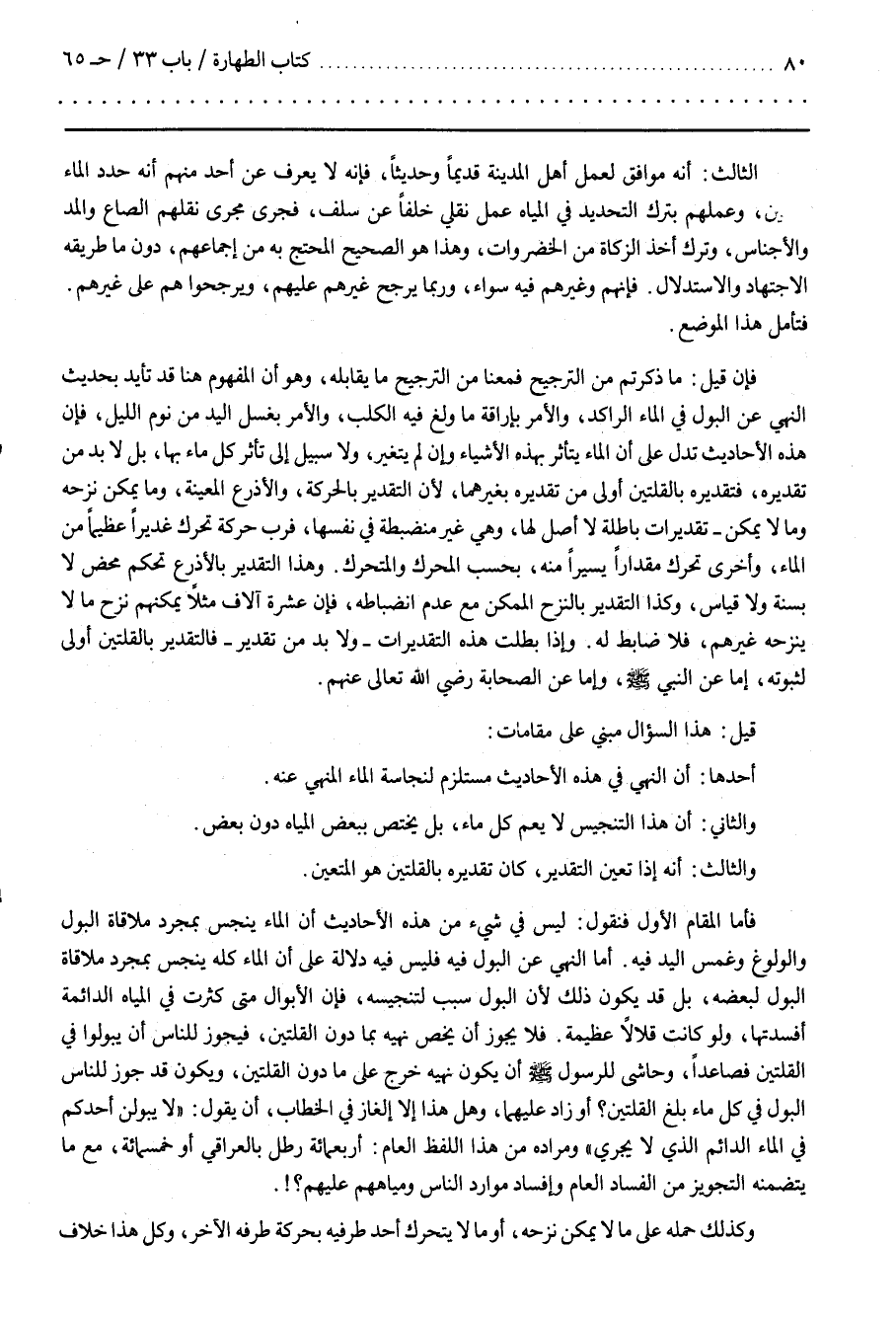 وَالثَّالِث أَنَّهُ إِذَا تَعَيَّنَ التَّقْدِير كَانَ تَقْدِيره بِالْقُلَّتَيْنِ هُوَ الْمُتَعَيِّن
