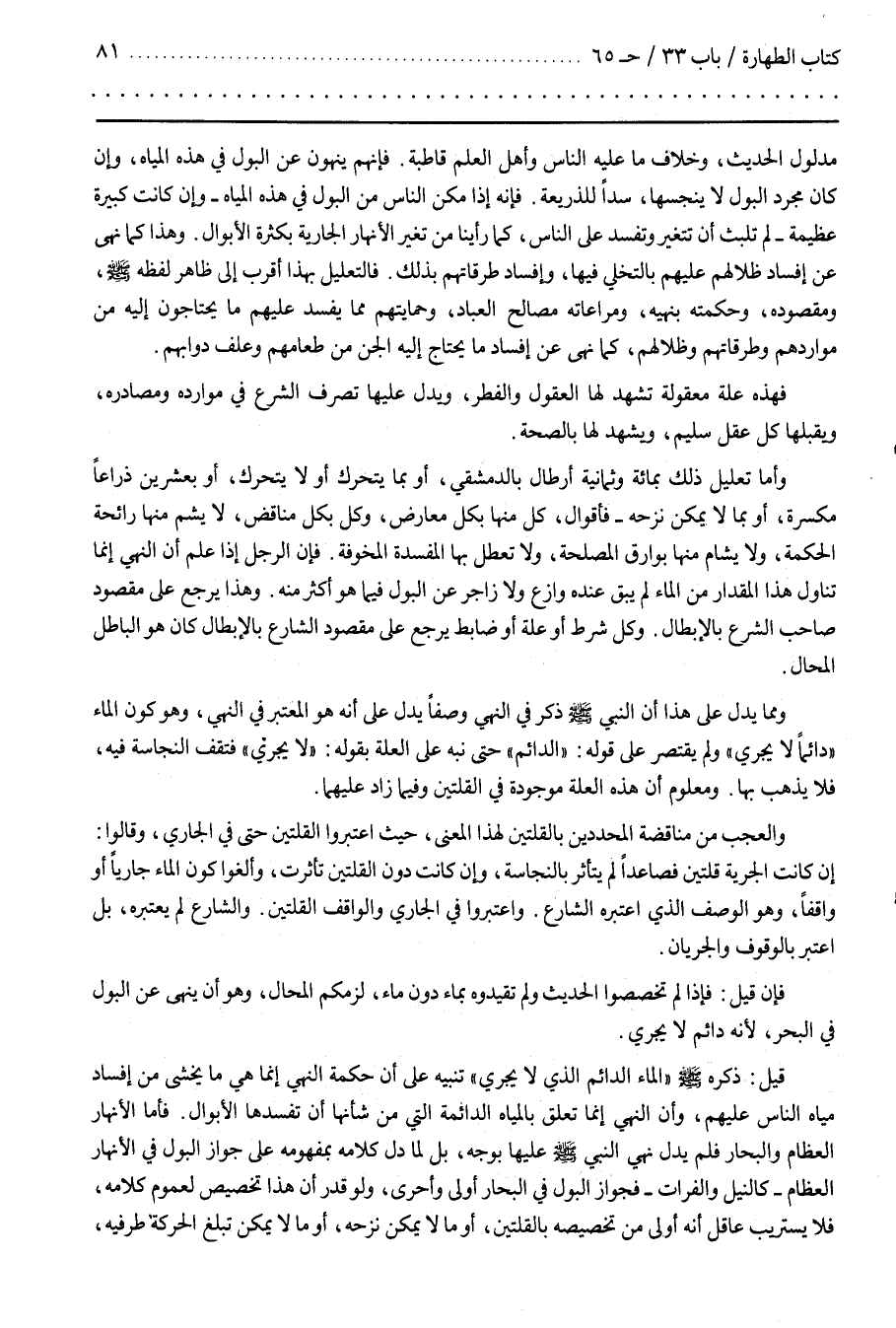 فَإِنَّهُ إِذَا مُكِّنَ النَّاس مِنْ الْبَوْل فِي هَذِهِ الْمِيَاه وَإِنْ كَانَتْ كَبِيرَة عَظِيمَة لَمْ تَلْبَث أَنْ تَتَغَيَّر وَتَفْسُد عَلَى النَّاس كَمَا رَأَيْنَا مِنْ تَغَيُّر الْأَنْهَار الْجَارِيَة بِكَثْرَةِ الْأَبْوَال