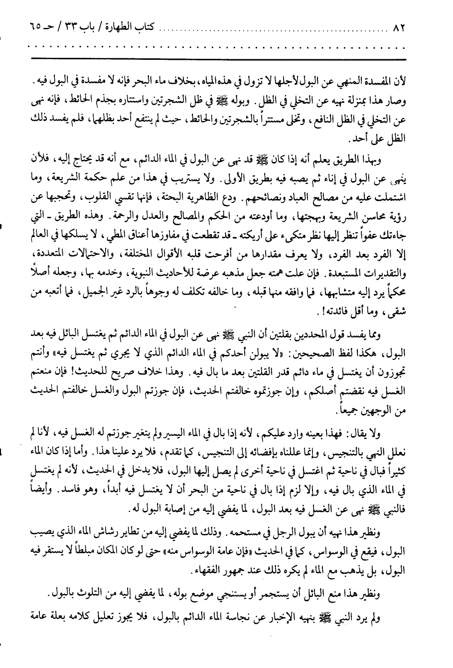 فَإِنْ عَلَتْ هِمَّته جَعَلَ مَذْهَبه عُرْضَة لِلْأَحَادِيثِ النَّبَوِيَّة وَخَدَمَهُ بِهَا وَجَعَلَهُ أَصْلًا مُحْكَمًا يَرُدّ إِلَيْهِ مُتَشَابِههَا فَمَا وَافَقَهُ مِنْهَا قَبِلَهُ وَمَا خَالَفَهُ تَكَلَّفَ لَهُ وُجُوهًا بِالرَّدِّ غَيْر الْجَمِيل فَمَا أَتْعَبَهُ مِنْ شَقِيّ وَمَا أَقَلّ فَائِدَته وَمِمَّا يُفْسِد قَوْل الْمُحَدِّدِينَ بِقُلَّتَيْنِ أَنَّ النَّبِيّ نَهَى عَنْ الْبَوْل فِي الْمَاء الدَّائِم ثُمَّ يَغْتَسِل الْبَائِل فِيهِ بَعْد الْبَوْل